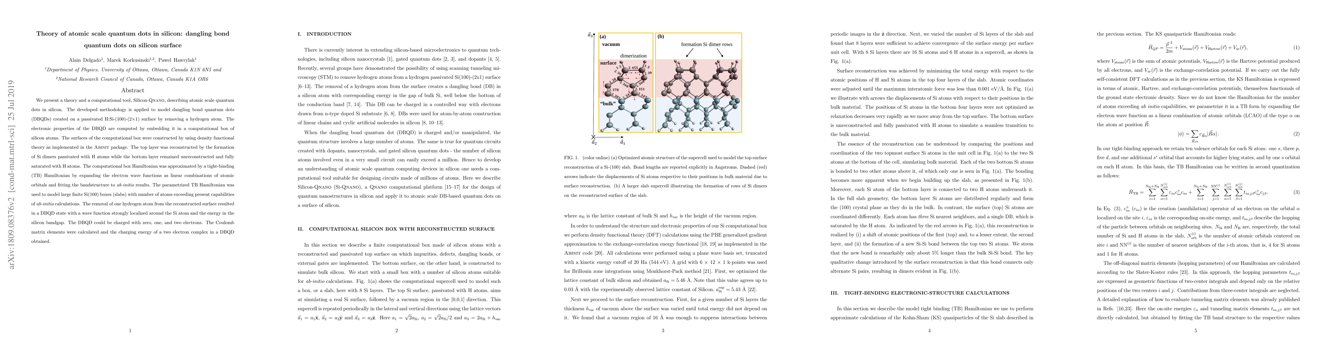 We present here a theory and a computational tool, Silicon-{\sc Qnano}, to describe atomic scale quantum dots in Silicon. The methodology is applied to model dangling bond quantum dots (DBQDs) created on a passivated H:Si-(100)-(2$\times$1) surface by removal of a Hydrogen atom. The electronic properties of DBQD are computed by embedding it in a computational box of Silicon atoms. The surfaces of the computational box were constructed by using DFT as implemented in {\sc Abinit} program. The top layer was reconstructed by the formation of Si dimers passivated with H atoms while the bottom layer remained unreconstructed and fully saturated with H atoms. The computational box Hamiltonian was approximated by a tight-binding (TB) Hamiltonian by expanding the electron wave functions as a Linear Combination of Atomic Orbitals and fitting the bandstructure to {\it ab-initio} results. The parametrized TB Hamiltonian was used to model large finite Si(100) boxes (slabs) with number of atoms exceeding present capabilities of {\it ab-initio} calculations. The removal of one hydrogen atom from the reconstructed surface resulted in a DBQD state with wave function strongly localized around the Si atom and energy in the silicon bandgap. The DBQD could be charged with zero, one and two electrons. The Coulomb matrix elements were calculated and the charging energy of a two electron complex in a DBQD obtained.