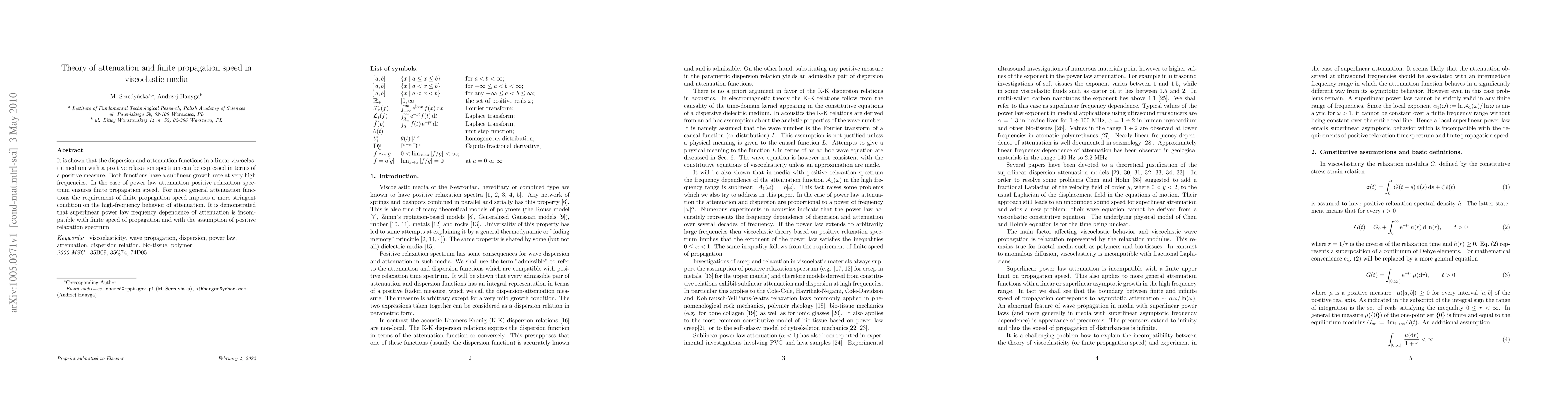 This paper demonstrates that dispersion and attenuation in linear viscoelastic media can be described using a positive measure, with both functions showing sublinear growth at high frequencies. It concludes that a positive relaxation spectrum ensures finite propagation speed, but superlinear power law frequency dependence of attenuation contradicts finite propagation speed and the positive relaxation spectrum assumption.