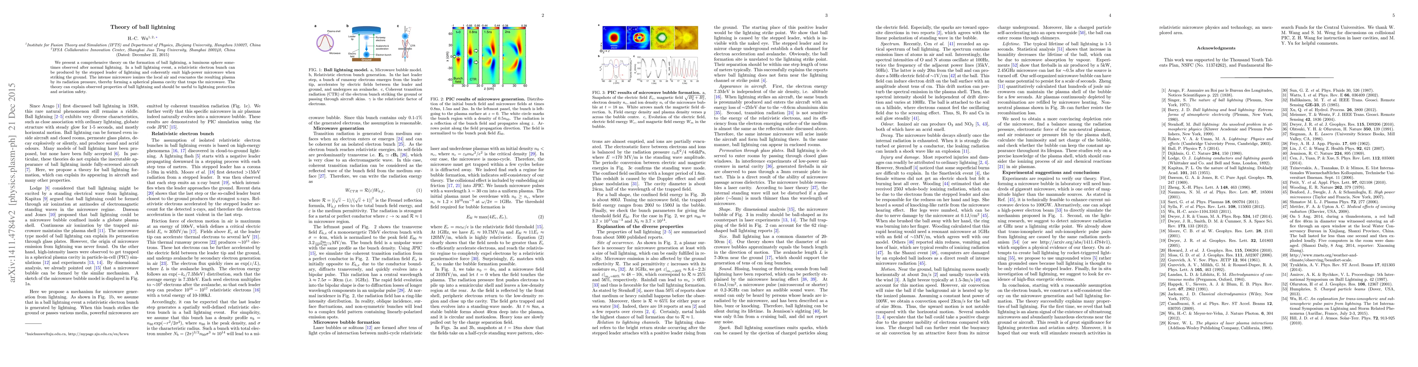 The paper presents a comprehensive theory on ball lightning formation, involving relativistic electron bunches produced by lightning's stepped leader, which emit coherent microwave radiation upon striking the ground, ionizing air and forming a spherical plasma cavity trapped by radiation pressure.