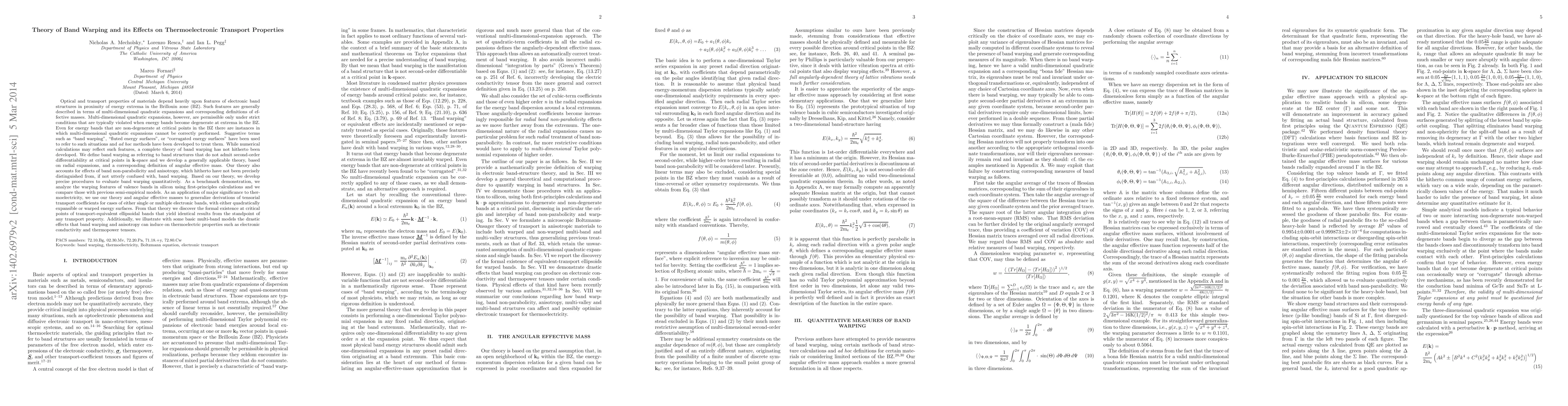This paper develops a comprehensive theory of band warping, addressing its impact on thermoelectronic transport properties. It introduces a radial expansion-based approach to define angular effective mass, distinguishing it from band non-parabolicity and anisotropy, and demonstrates its application through the analysis of silicon valence bands.