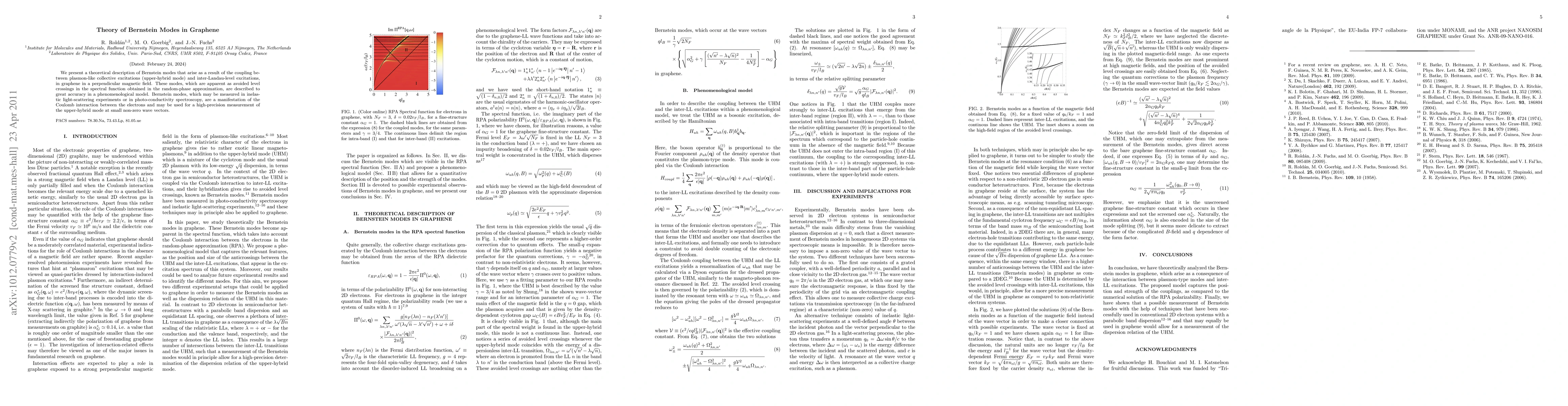 We present a theoretical description of Bernstein modes that arise as a result of the coupling between plasmon-like collective excitations (upper-hybrid mode) and inter-Landau-level excitations, in graphene in a perpendicular magnetic field. These modes, which are apparent as avoided level crossings in the spectral function obtained in the random-phase approximation, are described to great accuracy in a phenomenological model. Bernstein modes, which may be measured in inelastic light-scattering experiments or in photo-conductivity spectroscopy, are a manifestation of the Coulomb interaction between the electrons and may be used for a high-precision measurement of the upper-hybrid mode at small non-zero wave vectors.