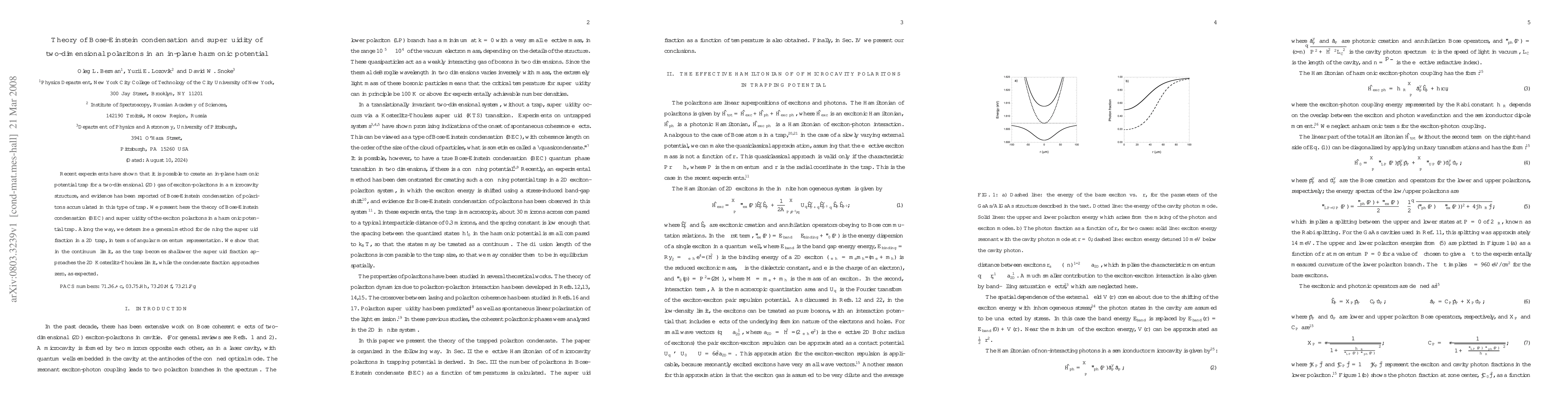 This paper develops a theoretical framework for Bose-Einstein condensation and superfluidity of two-dimensional polaritons in an in-plane harmonic potential trap, demonstrating the superfluid fraction's behavior in terms of angular momentum representation and showing the transition to the 2D Kosterlitz-Thouless limit as the trap becomes shallower.