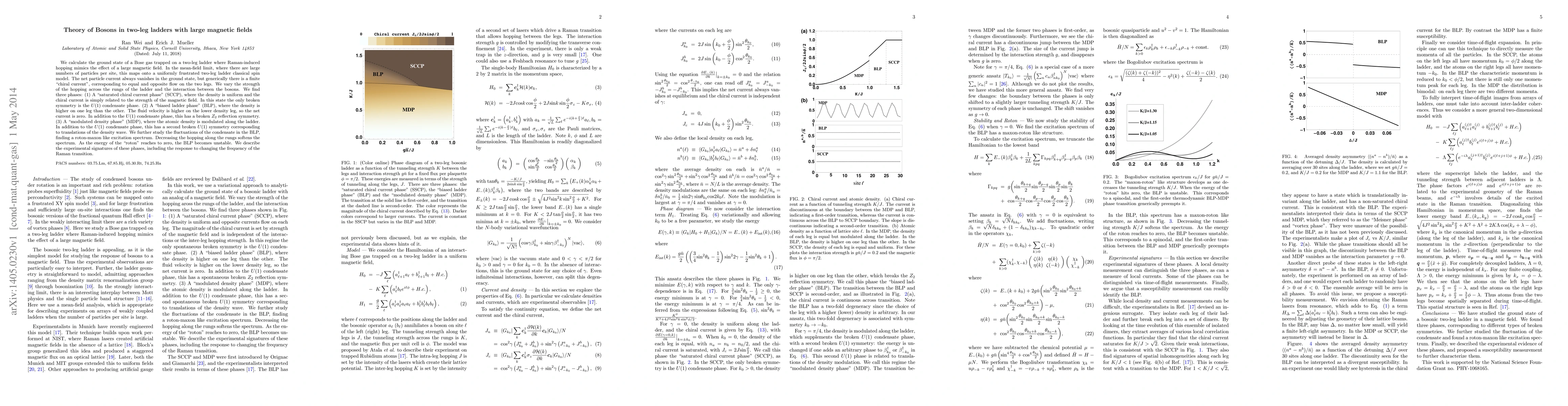 This paper investigates the ground state phases of a Bose gas on a two-leg ladder under large magnetic fields, revealing three distinct phases: a saturated chiral current phase, a biased ladder phase, and a modulated density phase, each characterized by unique symmetry breakings and current behaviors. The study also explores the excitation spectrum and experimental signatures of these phases.