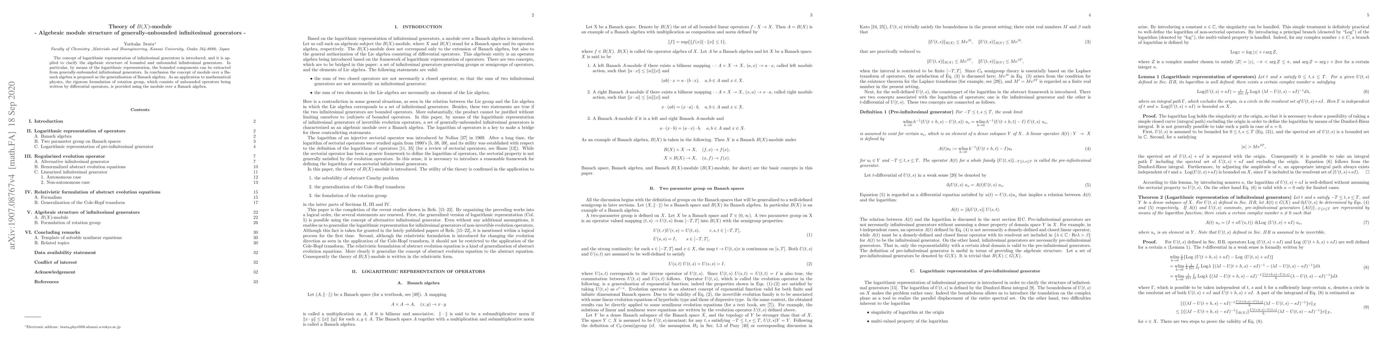 The concept of logarithmic representation of infinitesimal generators is introduced, and it is applied to clarify the algebraic structure of bounded and unbounded infinitesimal generators. In particular, by means of the logarithmic representation, the bounded components can be extracted from generally-unbounded infinitesimal generators. In conclusion the concept of module over a Banach algebra is proposed as the generalization of Banach algebra. As an application to mathematical physics, the rigorous formulation of rotation group, which consists of unbounded operators being written by differential operators, is provided using the module over a Banach algebra.