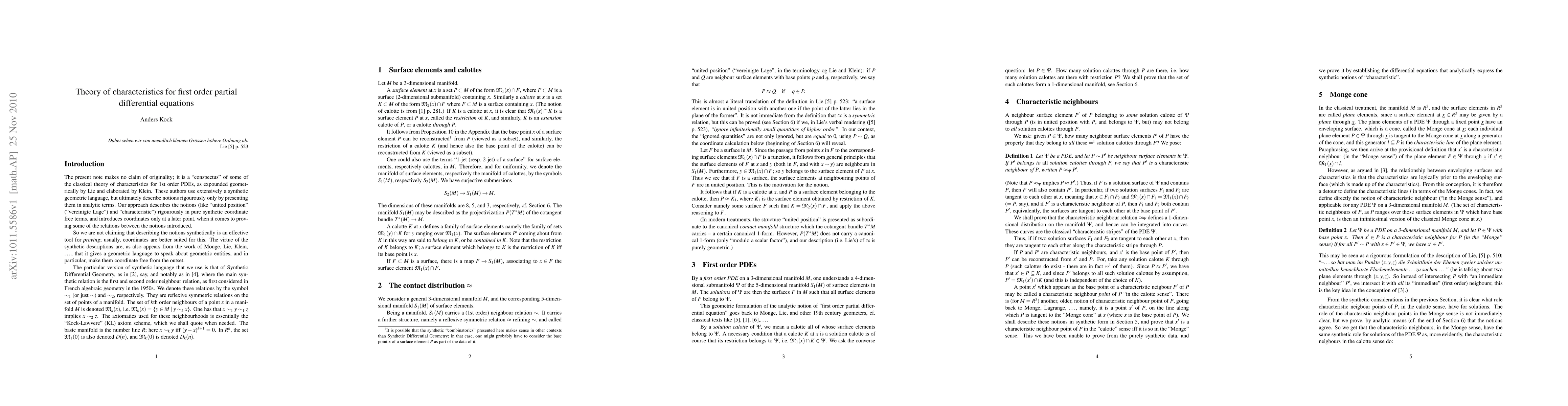 We use the method of synthetic differential geometry to revisit the geometric reasoning employed by Lie, Klein and others in their study of partial differential equations.