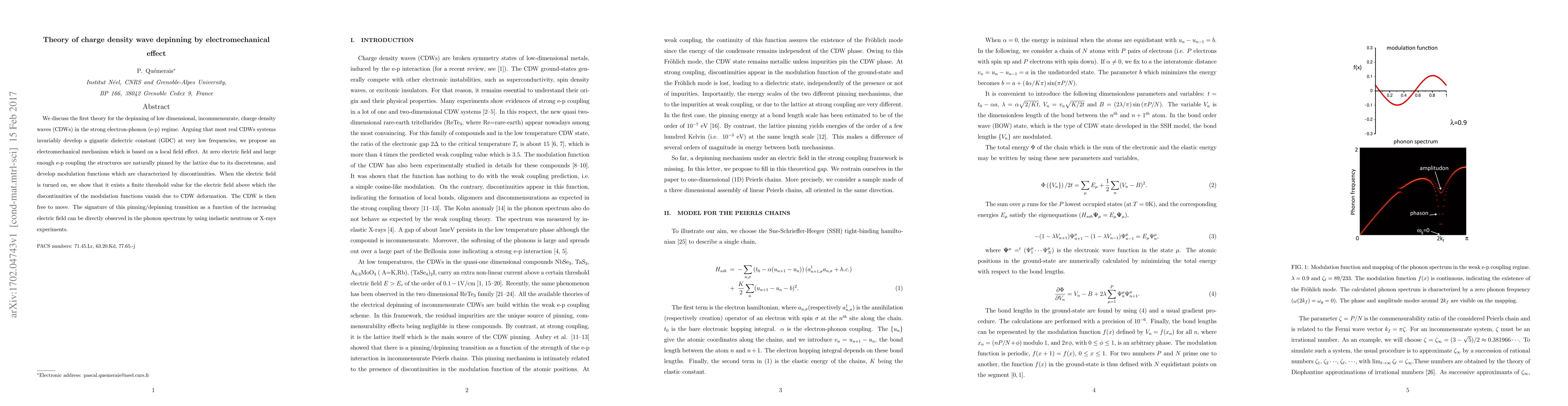 We discuss the first theory for the depinning of low dimensional, incommensurate, charge density waves (CDWs) in the strong electron-phonon (e-p) regime. Arguing that most real CDWs systems invariably develop a gigantic dielectric constant (GDC) at very low frequencies, we propose an electromechanical mechanism which is based on a local field effect. At zero electric field and large enough e-p coupling the structures are naturally pinned by the lattice due to its discreteness, and develop modulation functions which are characterized by discontinuities. When the electric field is turned on, we show that it exists a finite threshold value for the electric field above which the discontinuities of the modulation functions vanish due to CDW deformation. The CDW is then free to move. The signature of this pinning/depinning transition as a function of the increasing electric field can be directly observed in the phonon spectrum by using inelastic neutrons or X-rays experiments.