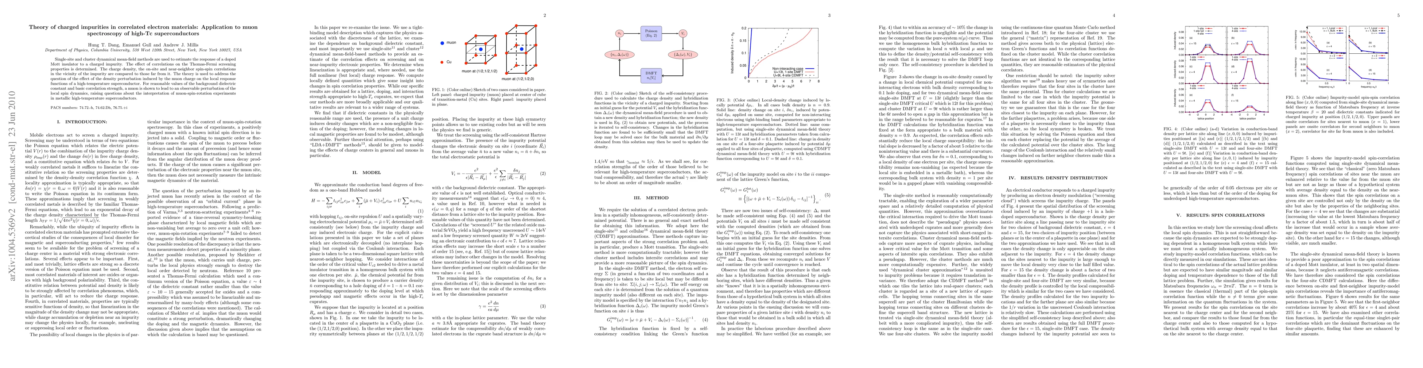 Single-site and cluster dynamical mean-field methods are used to estimate the response of a doped Mott insulator to a charged impurity. The effect of correlations on the Thomas-Fermi screening properties is determined. The charge density, the on-site and near-neighbor spin-spin correlations in the vicinity of the impurity are compared to those far from it. The theory is used to address the question of the effect of the density perturbation induced by the muon charge on the local response functions of a high-temperature superconductor. For reasonable values of the background dielectric constant and basic correlation strength, a muon is shown to lead to an observable perturbation of the local spin dynamics, raising questions about the interpretation of muon-spin-rotation experiments in metallic high-temperature superconductors.