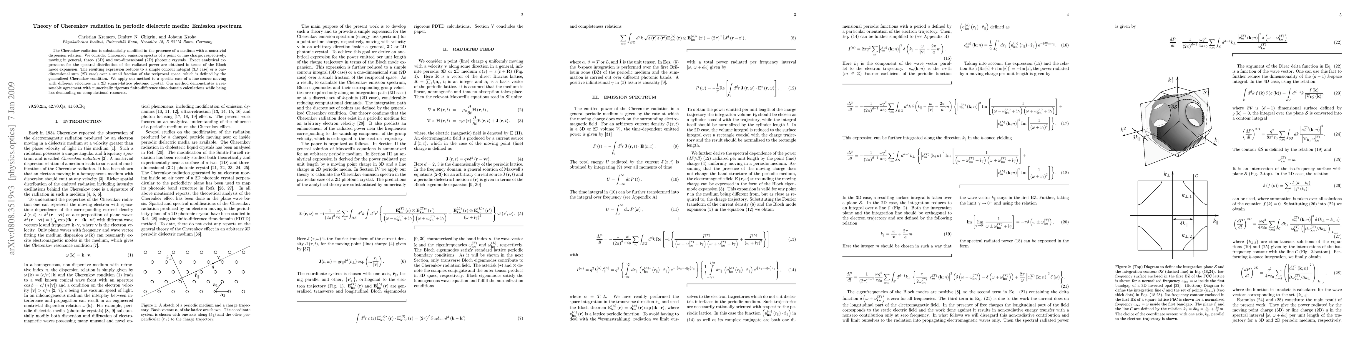 This paper develops an analytical theory for Cherenkov radiation in periodic dielectric media, deriving exact expressions for the emission spectra in 3D and 2D photonic crystals. The method shows excellent agreement with numerical simulations and is computationally efficient.