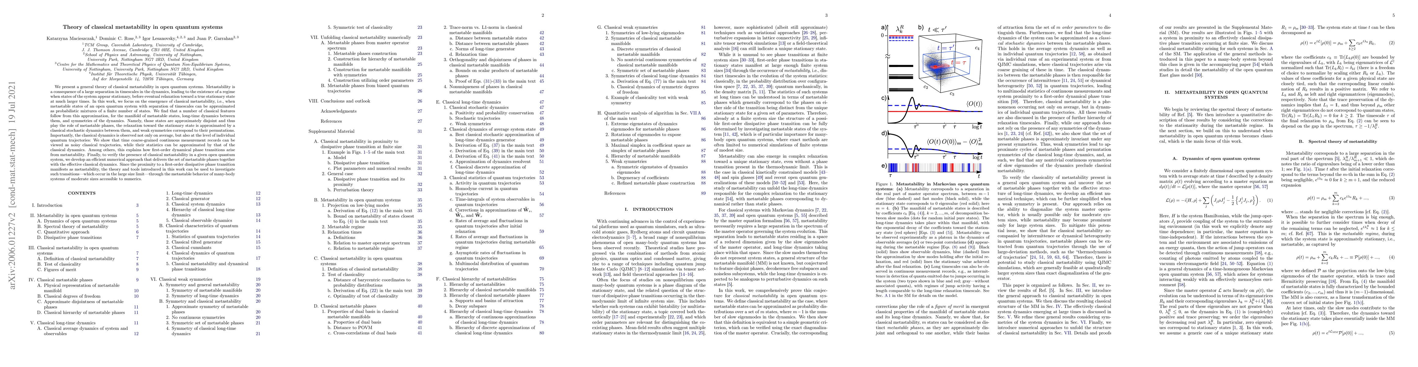 This paper develops a theory for classical metastability in open quantum systems, showing that metastable states can be approximated as probabilistic mixtures of a finite number of states. It reveals how classical features, such as disjoint metastable phases and stochastic dynamics, emerge and can be observed in individual quantum trajectories via noisy classical measurements. The paper also introduces a numerical method to identify metastable phases and effective classical dynamics, useful for studying first-order dynamical phase transitions.