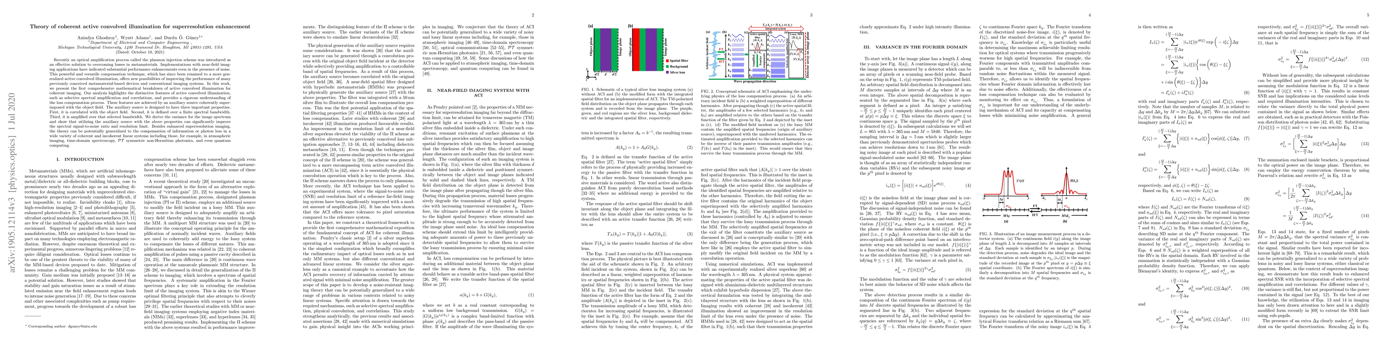 This paper introduces a mathematical framework for coherent active convolved illumination, a technique that enhances superresolution imaging by compensating for losses in metamaterials. The theory utilizes an auxiliary source to achieve selective spectral amplification, significantly improving the spectral signal-to-noise ratio and resolution limits, with potential applications across various fields including atmospheric imaging and quantum computing.