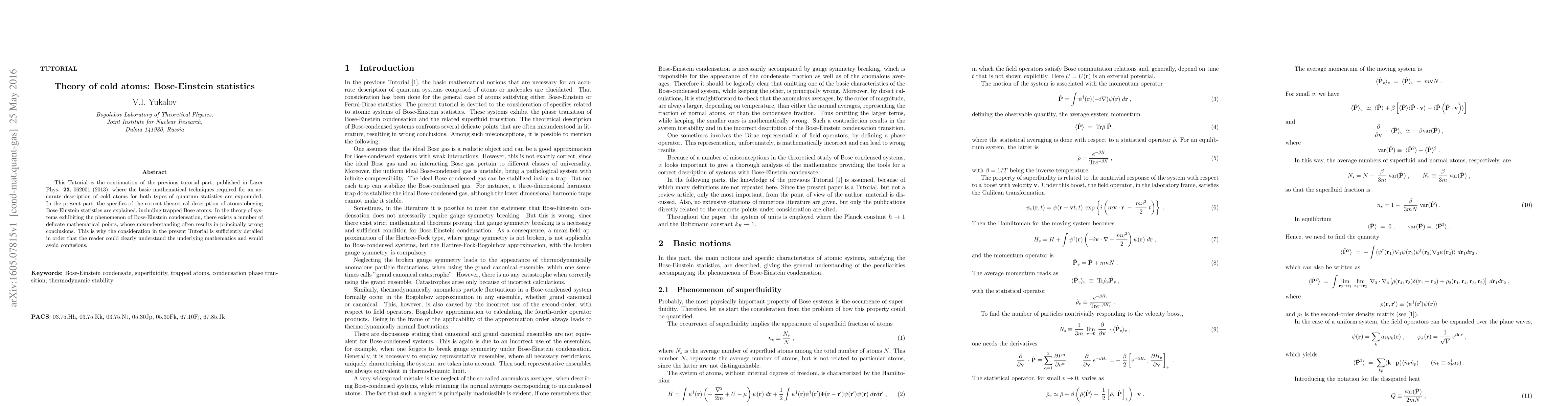 This paper provides a detailed continuation on the mathematical techniques for describing cold atoms, focusing specifically on Bose-Einstein statistics. It aims to clarify the theoretical framework for trapped Bose atoms and avoid common mathematical pitfalls in the study of Bose-Einstein condensation.