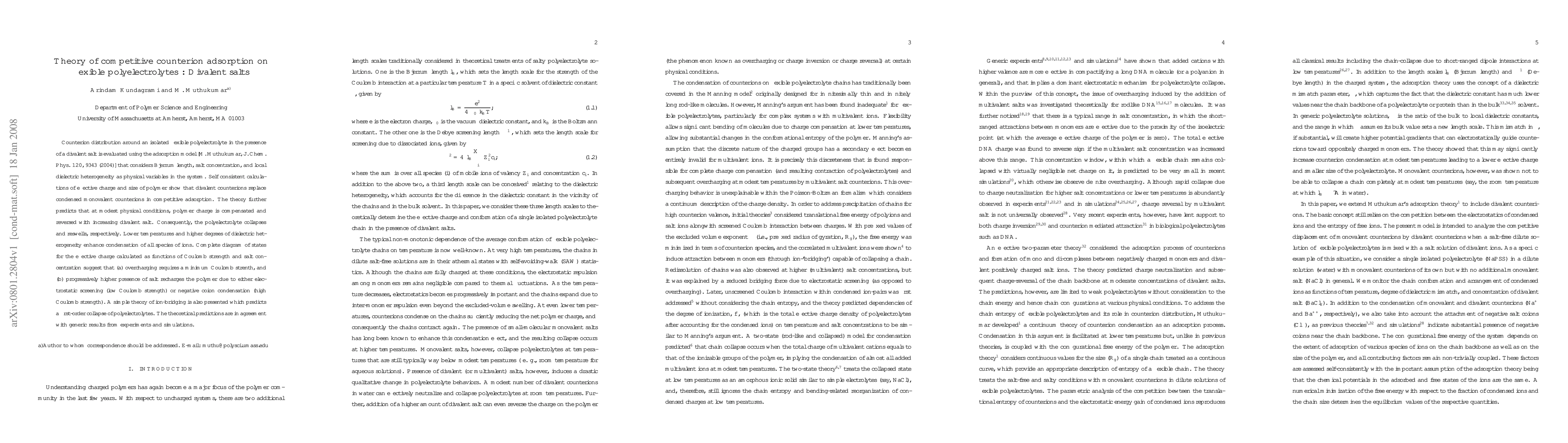 This paper evaluates the competitive adsorption of divalent counterions on flexible polyelectrolytes using a theoretical model, showing that divalent salts can replace monovalent counterions, leading to polymer charge reversal and collapse. The theory also predicts overcharging and ion-bridging effects, which align with experimental and simulation results.