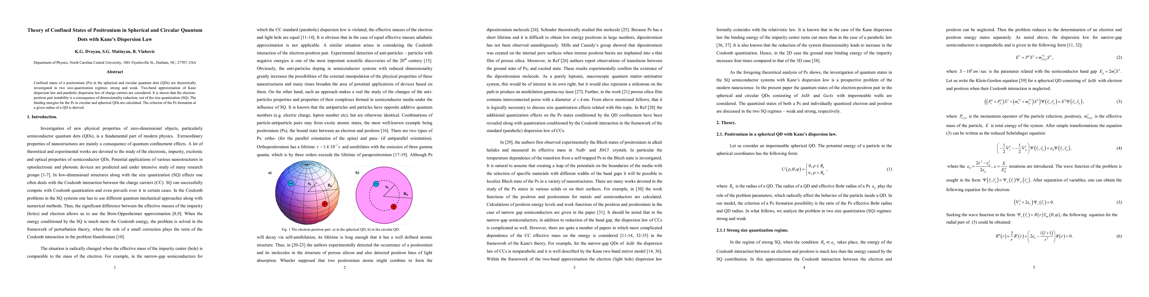 This research theoretically explores positronium (Ps) confined states in spherical and circular quantum dots (QDs), using Kane's dispersion law in strong and weak size-quantization regimes. It finds that Ps instability stems from dimensionality reduction, not size quantization, and calculates binding energies for Ps in both QD types, examining Ps formation's dependence on QD radius.