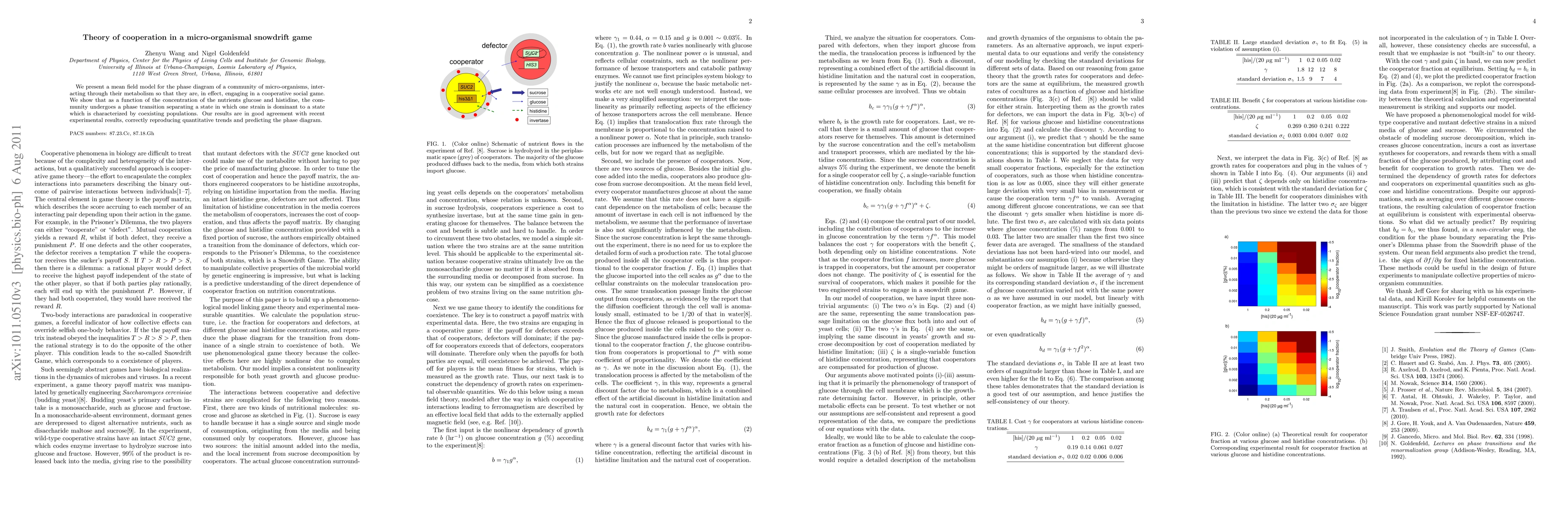 We present a mean field model for the phase diagram of a community of micro-organisms, interacting through their metabolism so that they are, in effect, engaging in a cooperative social game. We show that as a function of the concentration of the nutrients glucose and histidine, the community undergoes a phase transition separating a state in which one strain is dominant to a state which is characterized by coexisting populations. Our results are in good agreement with recent experimental results, correctly predicting quantitative trends and the phase diagram.