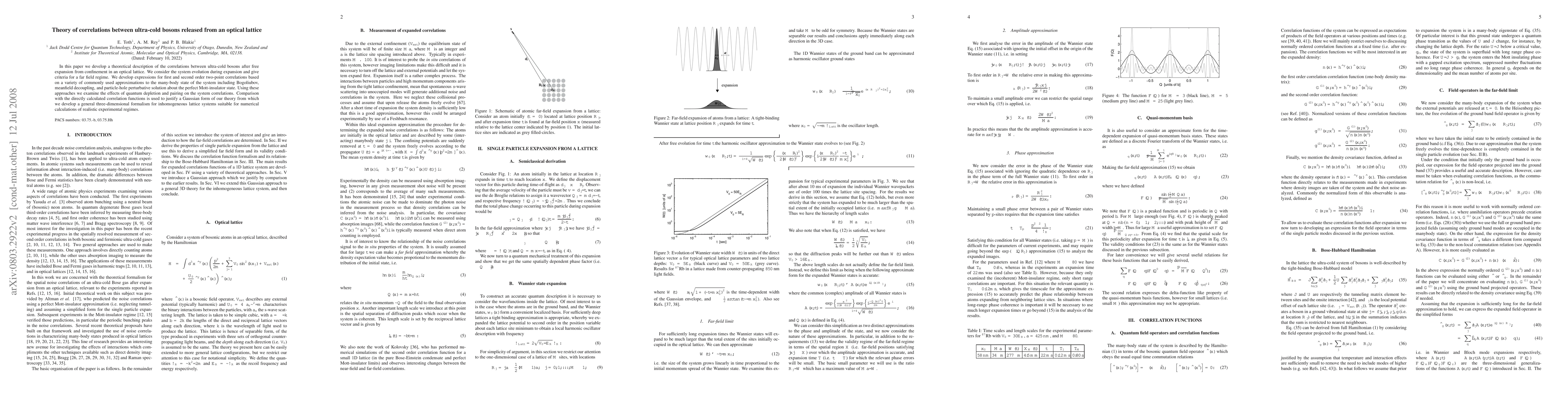 This paper develops a theoretical framework to describe correlations in ultra-cold bosons after release from an optical lattice, focusing on system evolution and criteria for a far field regime. It provides expressions for first and second order correlations using various approximations and examines the effects of quantum depletion and pairing, ultimately justifying a Gaussian form and developing a general three-dimensional formalism for inhomogeneous lattice systems.