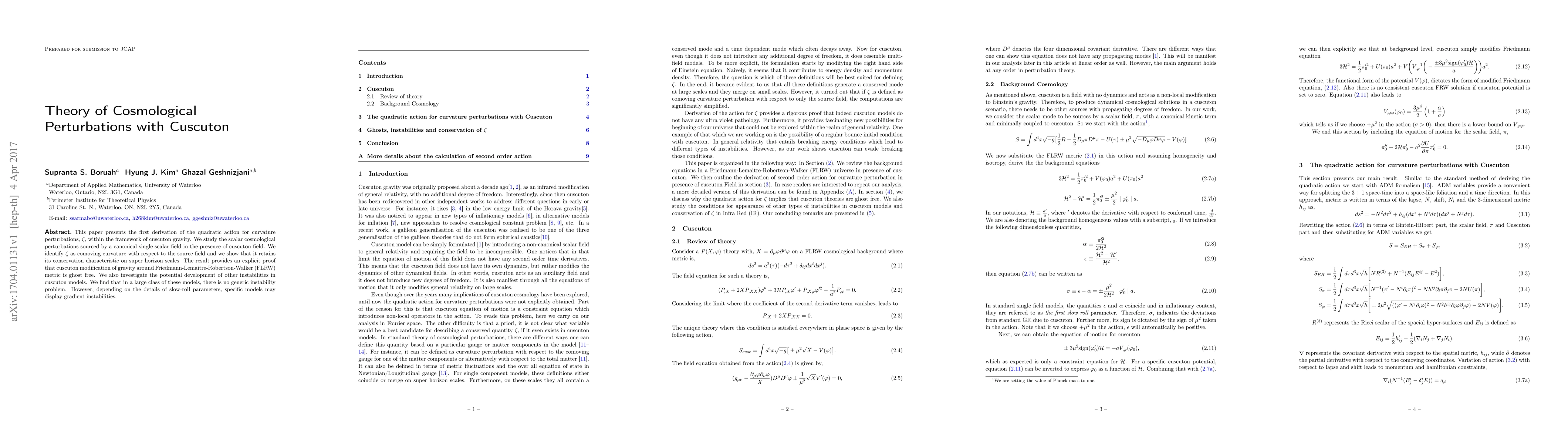 This paper derives the quadratic action for curvature perturbations in cuscuton gravity, confirming the conservation of comoving curvature and demonstrating the absence of ghost instabilities in most cuscuton models, though some may exhibit gradient instabilities based on slow-roll parameters.