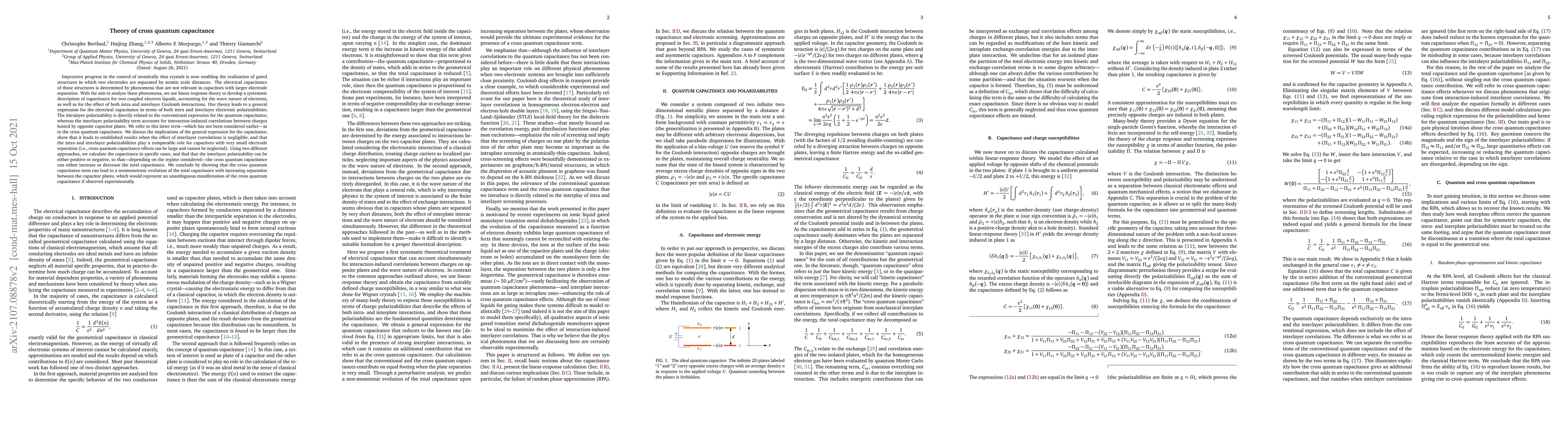Impressive progress in the control of atomically thin crystals is now enabling the realization of gated structures in which two electrodes are separated by atomic scale distances. The electrical capacitance of these structures is determined by phenomena that are not relevant in capacitors with larger electrode separation. With the aim to analyze these phenomena, we use linear response theory to develop a systematic description of capacitance for two coupled electron liquids, accounting for the wave nature of electrons, as well as for the effect of both intra and interlayer Coulomb interactions. Our theory leads to a general expression for the electrical capacitance in terms of both intra and interlayer electronic polarizabilities. The intralayer polarizability is directly related to the conventional expression for the quantum capacitance, whereas the interlayer polarizability term accounts for interaction-induced correlations between charges hosted by opposite capacitor plates. We refer to this latter term as to the cross quantum capacitance. We discuss the implications of the general expression for the capacitance, show that it leads to established results when the effect of interlayer correlations is negligible, and that the intra and interlayer polarizabilities play a comparable role for capacitors with very small electrode separation. Using two different approaches, we calculate the capacitance in specific cases, and find that the interlayer polarizability can be either positive or negative, so that the cross quantum capacitance can either increase or decrease the total capacitance. We conclude by showing that the cross quantum capacitance term can lead to a non-monotonic evolution of the total capacitance with increasing separation between the capacitor plates, which would represent an unambiguous manifestation of the cross quantum capacitance if observed experimentally.