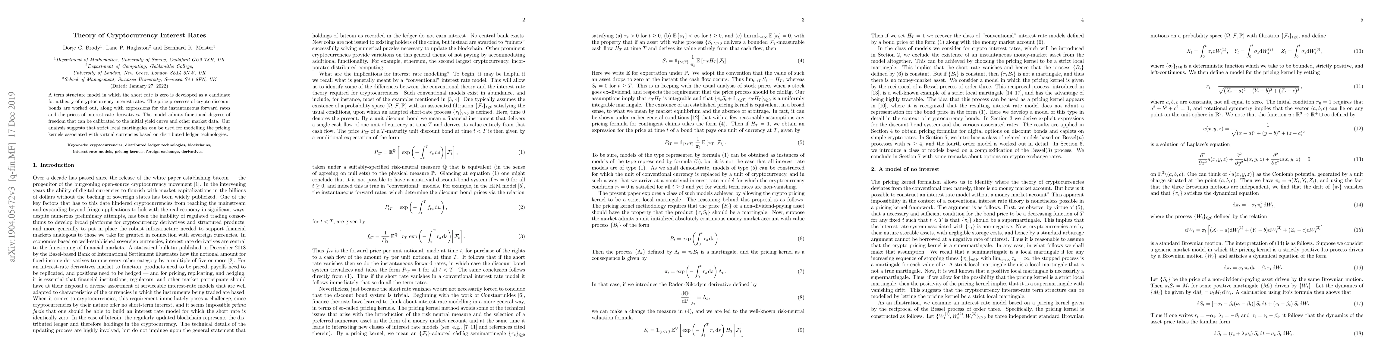 A term structure model in which the short rate is zero is developed as a candidate for a theory of cryptocurrency interest rates. The price processes of crypto discount bonds are worked out, along with expressions for the instantaneous forward rates and the prices of interest-rate derivatives. The model admits functional degrees of freedom that can be calibrated to the initial yield curve and other market data. Our analysis suggests that strict local martingales can be used for modelling the pricing kernels associated with virtual currencies based on distributed ledger technologies.