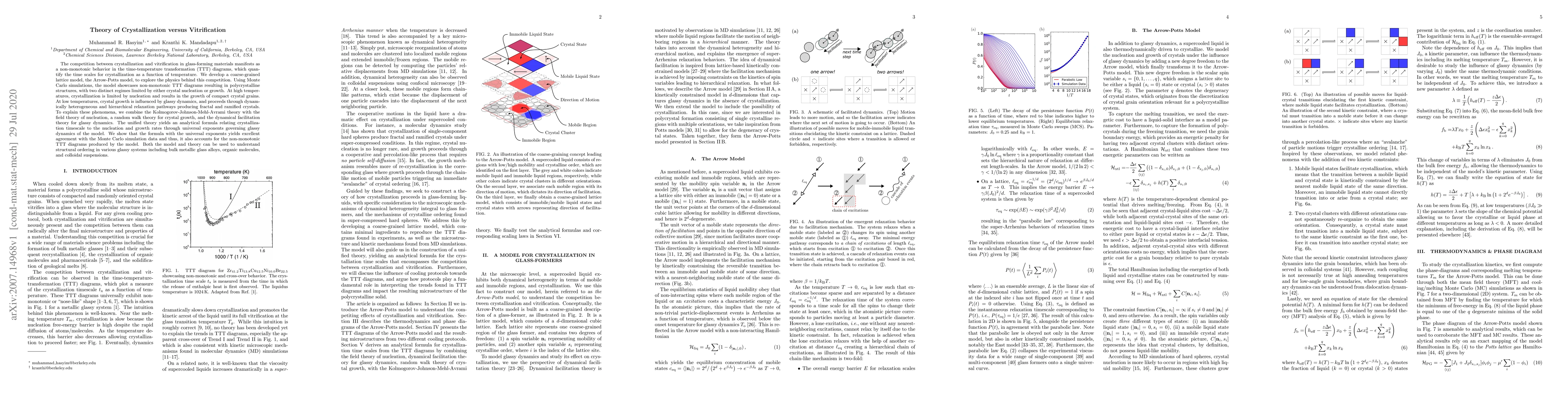 The competition between crystallization and vitrification in glass-forming materials manifests as a non-monotonic behavior in the time-temperature transformation (TTT) diagrams, which quantify the time scales for crystallization as a function of temperature. We develop a coarse-grained lattice model, the Arrow-Potts model, to explore the physics behind this competition. Using Monte Carlo simulations, the model showcases non-monotonic TTT diagrams resulting in polycrystalline structures, with two distinct regimes limited by either crystal nucleation or growth. At high temperatures, crystallization is limited by nucleation and results in the growth of compact crystal grains. At low temperatures, crystal growth is influenced by glassy dynamics, and proceeds through dynamically heterogeneous and hierarchical relaxation pathways producing fractal and ramified crystals. To explain these phenomena, we combine the Kolmogorov-Johnson-Mehl-Avrami theory with the field theory of nucleation, a random walk theory for crystal growth, and the dynamical facilitation theory for glassy dynamics. The unified theory yields an analytical formula relating crystallization timescale to the nucleation and growth rates through universal exponents governing glassy dynamics of the model. We show that the formula with the universal exponents yields excellent agreement with the Monte Carlo simulation data and thus, it also accounts for the non-monotonic TTT diagrams produced by the model. Both the model and theory can be used to understand structural ordering in various glassy systems including bulk metallic glass alloys, organic molecules, and colloidal suspensions.
