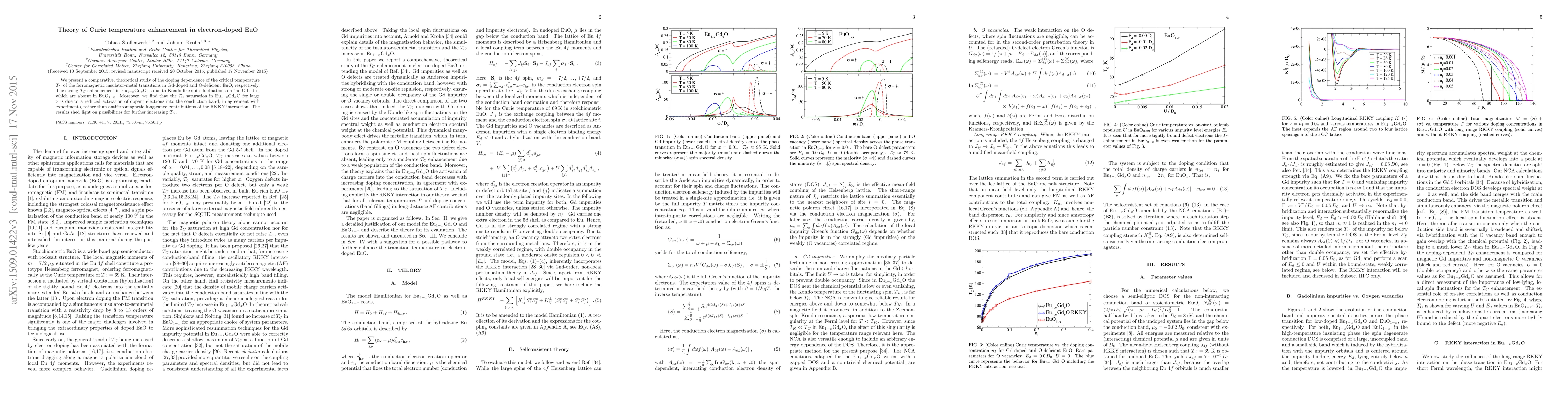 This paper theoretically investigates the enhancement of the Curie temperature $T_C$ in electron-doped EuO through Gd doping, attributing the increase to Kondo-like spin fluctuations. It concludes that $T_C$ saturation for large doping levels is due to reduced activation of dopant electrons, not antiferromagnetic RKKY interactions.