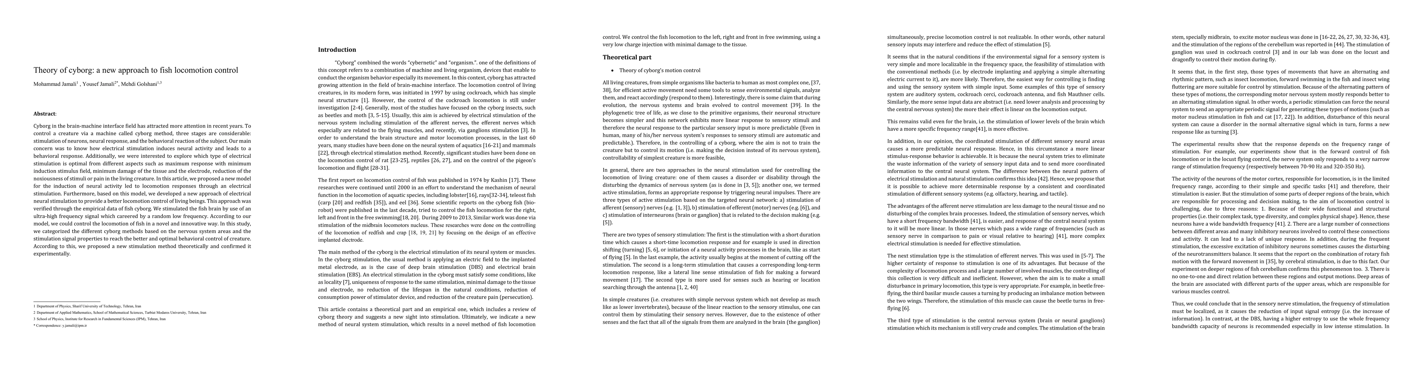 Cyborg in the brain-machine interface field has attracted more attention in recent years. To control a creature via a machine called cyborg method, three stages are considerable: stimulation of neurons, neural response, and the behavioral reaction of the subject. Our main concern was to know how electrical stimulation induces neural activity and leads to a behavioral response. Additionally, we were interested to explore which type of electrical stimulation is optimal from different aspects such as maximum response with minimum induction stimulus field, minimum damage of the tissue and the electrode, reduction of the noxiousness of stimuli or pain in the living creature. In this article, we proposed a new model for the induction of neural activity led to locomotion responses through electrical stimulation. Furthermore, based on this model, we developed a new approach of electrical neural stimulation to provide a better locomotion control of living beings. This approach was verified through the empirical data of fish cyborg. We stimulated the fish brain by use of an ultra-high frequency signal which careered by a random low frequency. According to our model, we could control the locomotion of fish in a novel and innovative way. In this study, we categorized the different cyborg methods based on the nervous system areas and the stimulation signal properties to reach the better and optimal behavioral control of creature. According to this, we proposed a new stimulation method theoretically and confirmed it experimentally.