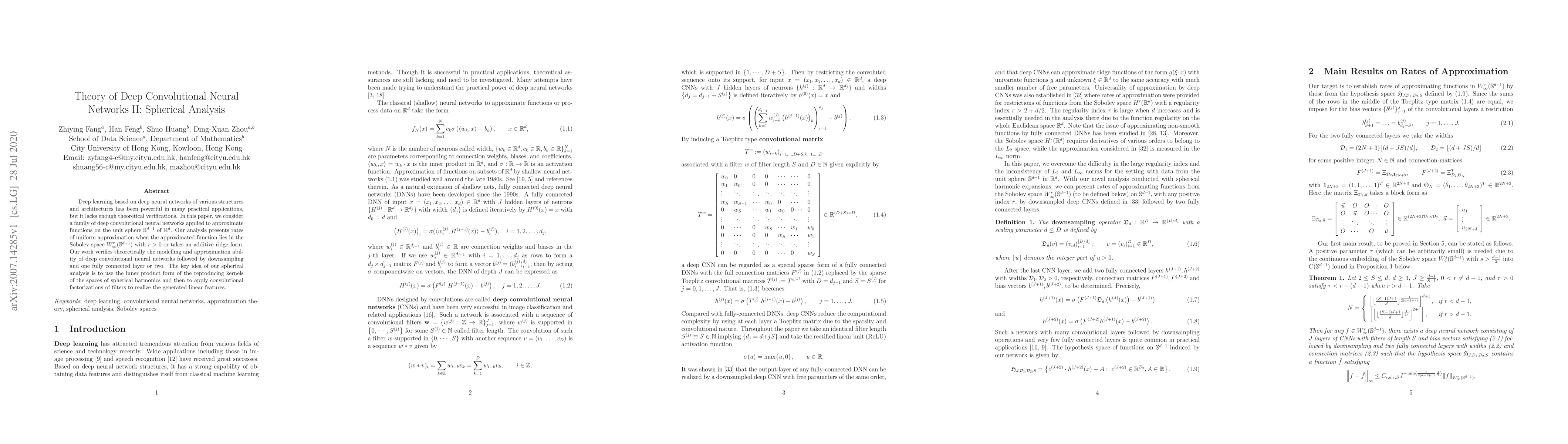 This paper theoretically verifies the approximation capabilities of deep convolutional neural networks on the unit sphere, showing uniform approximation rates for functions in Sobolev spaces. The analysis leverages spherical harmonics and convolutional factorizations to demonstrate the effectiveness of the network architecture.
