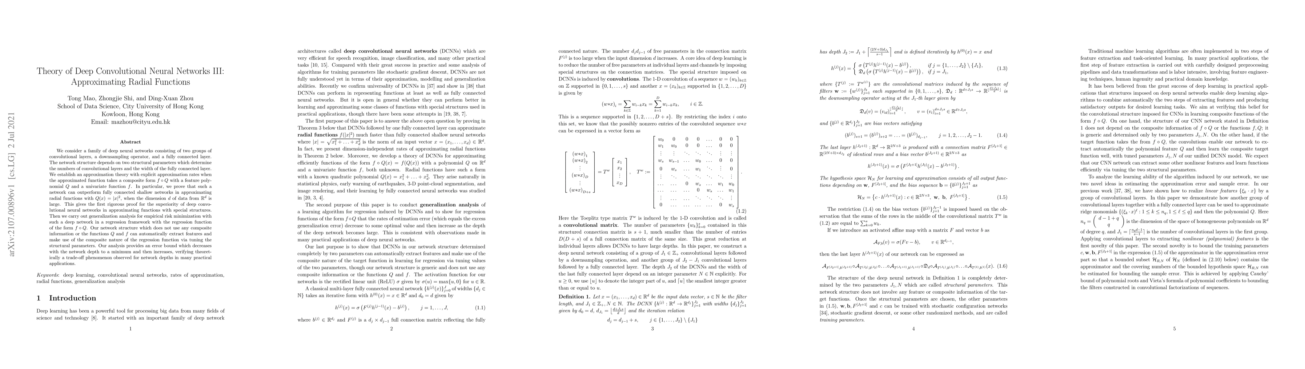 We consider a family of deep neural networks consisting of two groups of convolutional layers, a downsampling operator, and a fully connected layer. The network structure depends on two structural parameters which determine the numbers of convolutional layers and the width of the fully connected layer. We establish an approximation theory with explicit approximation rates when the approximated function takes a composite form $f\circ Q$ with a feature polynomial $Q$ and a univariate function $f$. In particular, we prove that such a network can outperform fully connected shallow networks in approximating radial functions with $Q(x) =|x|^2$, when the dimension $d$ of data from $\mathbb{R}^d$ is large. This gives the first rigorous proof for the superiority of deep convolutional neural networks in approximating functions with special structures. Then we carry out generalization analysis for empirical risk minimization with such a deep network in a regression framework with the regression function of the form $f\circ Q$. Our network structure which does not use any composite information or the functions $Q$ and $f$ can automatically extract features and make use of the composite nature of the regression function via tuning the structural parameters. Our analysis provides an error bound which decreases with the network depth to a minimum and then increases, verifying theoretically a trade-off phenomenon observed for network depths in many practical applications.