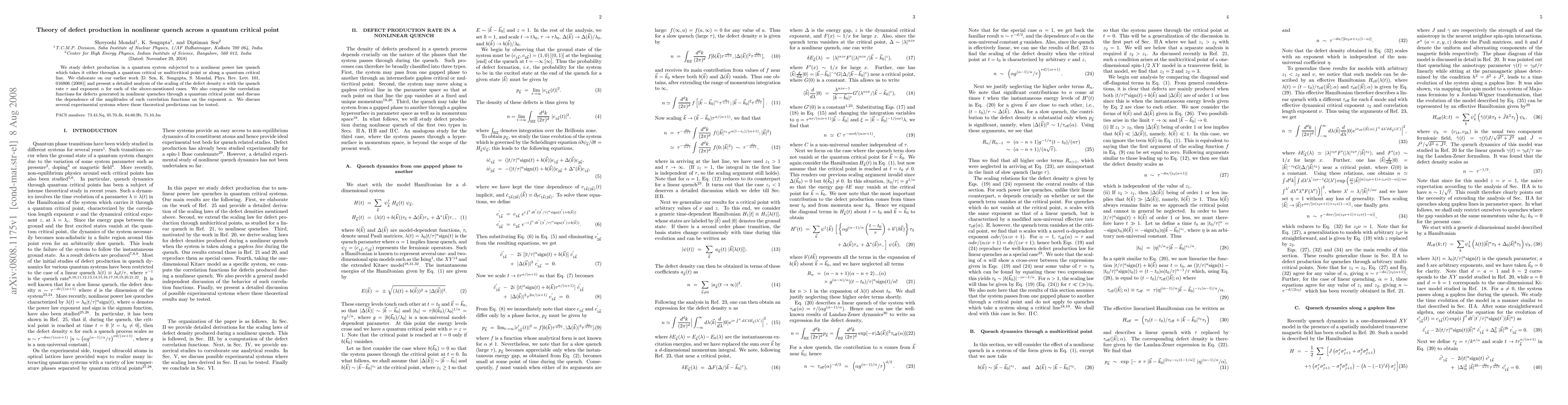 This paper explores the production of defects in quantum systems undergoing nonlinear quenches through critical points, analyzing the scaling of defect density with quench rate and exponent. It extends previous work and discusses potential experimental systems for testing these theoretical predictions.