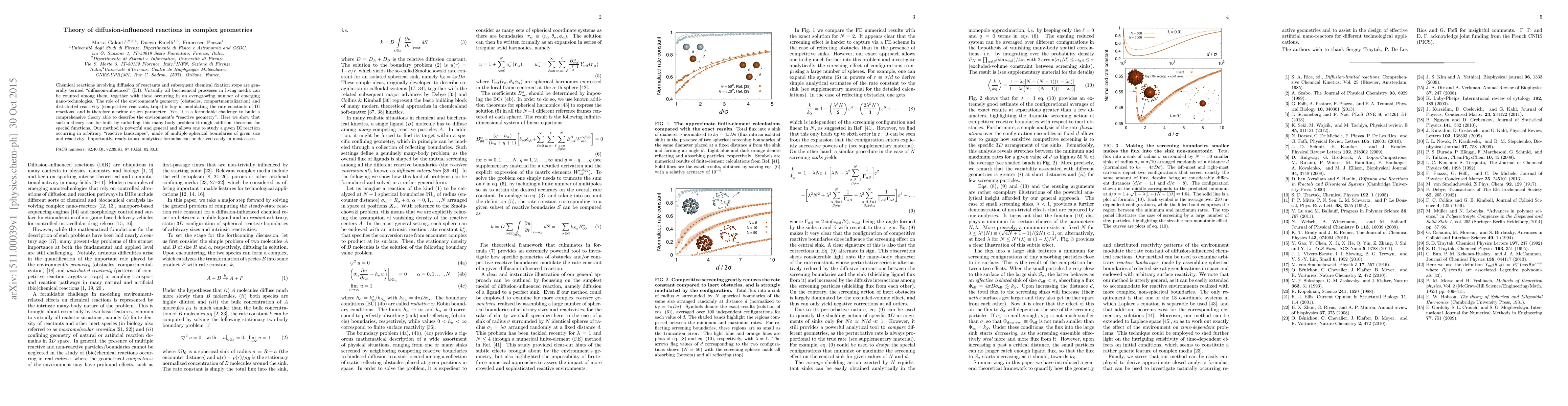 Chemical reactions involving diffusion of reactants and subsequent chemical fixation steps are generally termed "diffusion-influenced" (DI). Virtually all biochemical processes in living media can be counted among them, together with those occurring in an ever-growing number of emerging nano-technologies. The role of the environment's geometry (obstacles, compartmentalization) and distributed reactivity (competitive reactants, traps) is key in modulating the rate constants of DI reactions, and is therefore a prime design parameter. Yet, it is a formidable challenge to build a comprehensive theory able to describe the environment's "reactive geometry". Here we show that such a theory can be built by unfolding this many-body problem through addition theorems for special functions. Our method is powerful and general and allows one to study a given DI reaction occurring in arbitrary "reactive landscapes", made of multiple spherical boundaries of given size and reactivity. Importantly, ready-to-use analytical formulas can be derived easily in most cases.