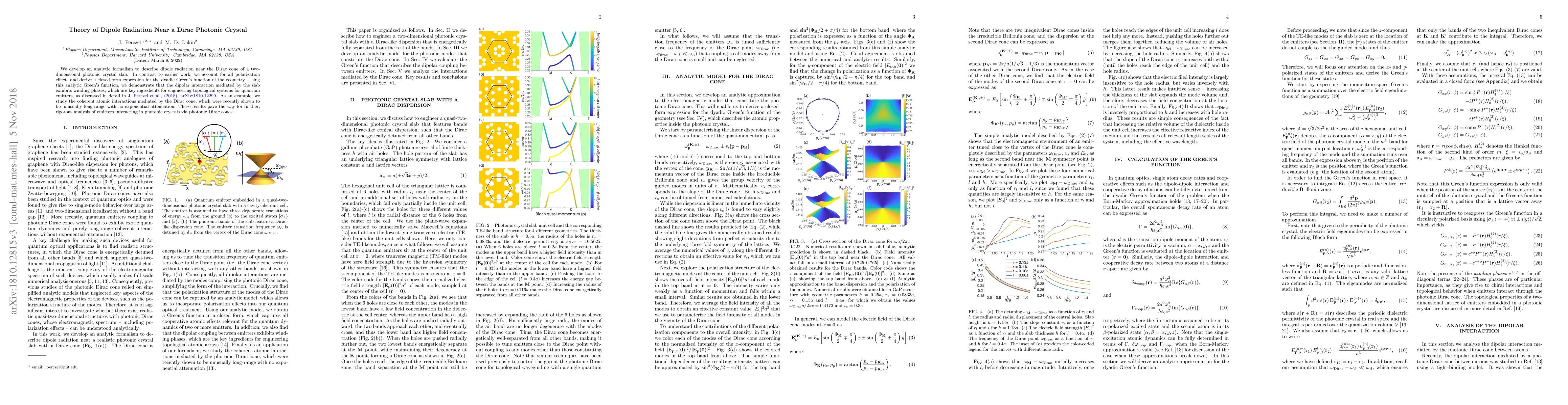 We develop an analytic formalism to describe dipole radiation near the Dirac cone of a two-dimensional photonic crystal slab. In contrast to earlier work, we account for all polarization effects and derive a closed-form expression for the dyadic Green's function of the geometry. Using this analytic Green's function, we demonstrate that the dipolar interaction mediated by the slab exhibits winding phases, which are key ingredients for engineering topological systems for quantum emitters, as discussed in detail in J. Perczel et al., (2018), arXiv:1810.12299. As an example, we study the coherent atomic interactions mediated by the Dirac cone, which were recently shown to be unusually long-range with no exponential attenuation. These results pave the way for further, rigorous analysis of emitters interacting in photonic crystals via photonic Dirac cones.