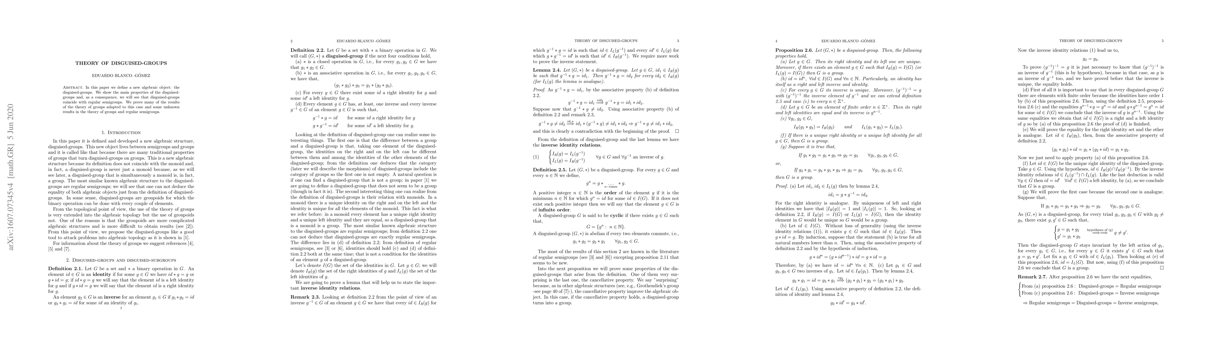 Researchers introduce a new algebraic object called disguised-groups, showing they coincide with regular semigroups and proving key properties and results from group theory adapted to this case.