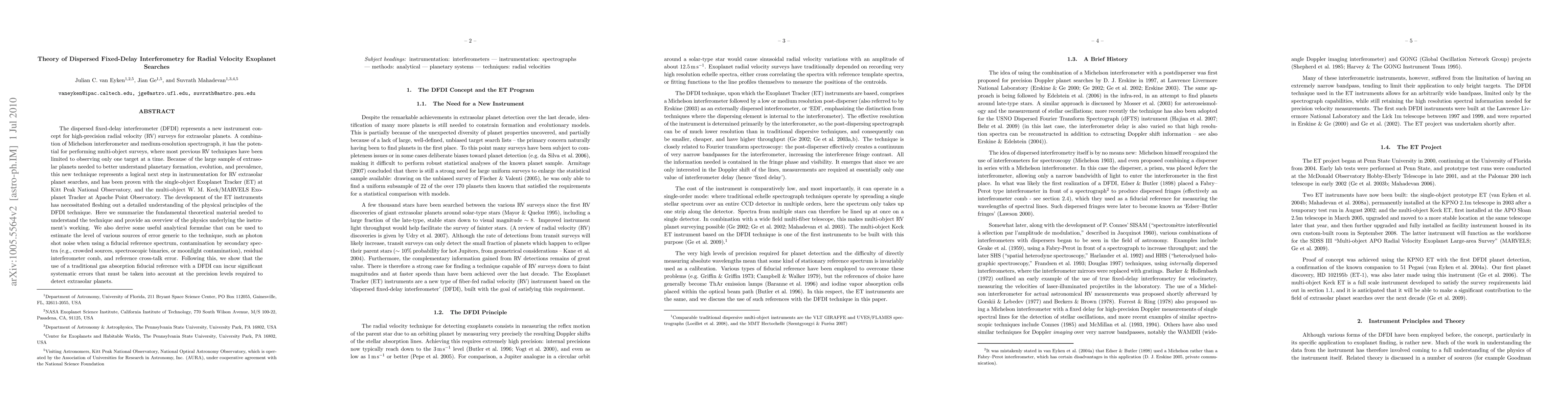 This paper introduces the theory behind the dispersed fixed-delay interferometer (DFDI) for high-precision radial velocity surveys of extrasolar planets, highlighting its potential for multi-object surveys. It provides analytical formulae to estimate various error sources and discusses the systematic errors associated with traditional gas absorption fiducial references, essential for achieving the precision needed for exoplanet detection.