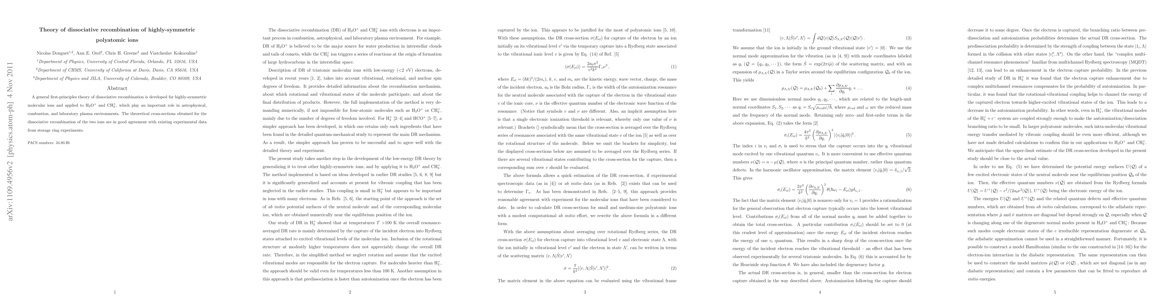 This paper develops a first-principles theory for dissociative recombination of highly-symmetric polyatomic ions, applying it to H$_3$O$^{+}$ and CH$_3^+$, and finds good agreement with experimental data, highlighting its relevance in astrophysical, combustion, and plasma environments.