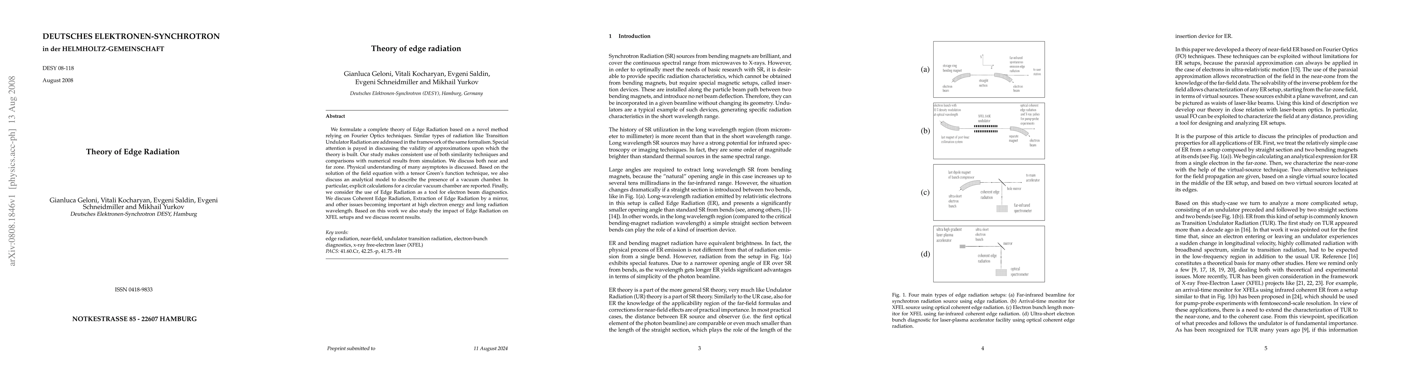 We formulate a complete theory of Edge Radiation based on a novel method relying on Fourier Optics techniques. Similar types of radiation like Transition Undulator Radiation are addressed in the framework of the same formalism. Special attention is payed in discussing the validity of approximations upon which the theory is built. Our study makes consistent use of both similarity techniques and comparisons with numerical results from simulation. We discuss both near and far zone. Physical understanding of many asymptotes is discussed. Based on the solution of the field equation with a tensor Green's function technique, we also discuss an analytical model to describe the presence of a vacuum chamber. In particular, explicit calculations for a circular vacuum chamber are reported. Finally, we consider the use of Edge Radiation as a tool for electron beam diagnostics. We discuss Coherent Edge Radiation, Extraction of Edge Radiation by a mirror, and other issues becoming important at high electron energy and long radiation wavelength. Based on this work we also study the impact of Edge Radiation on XFEL setups and we discuss recent results.