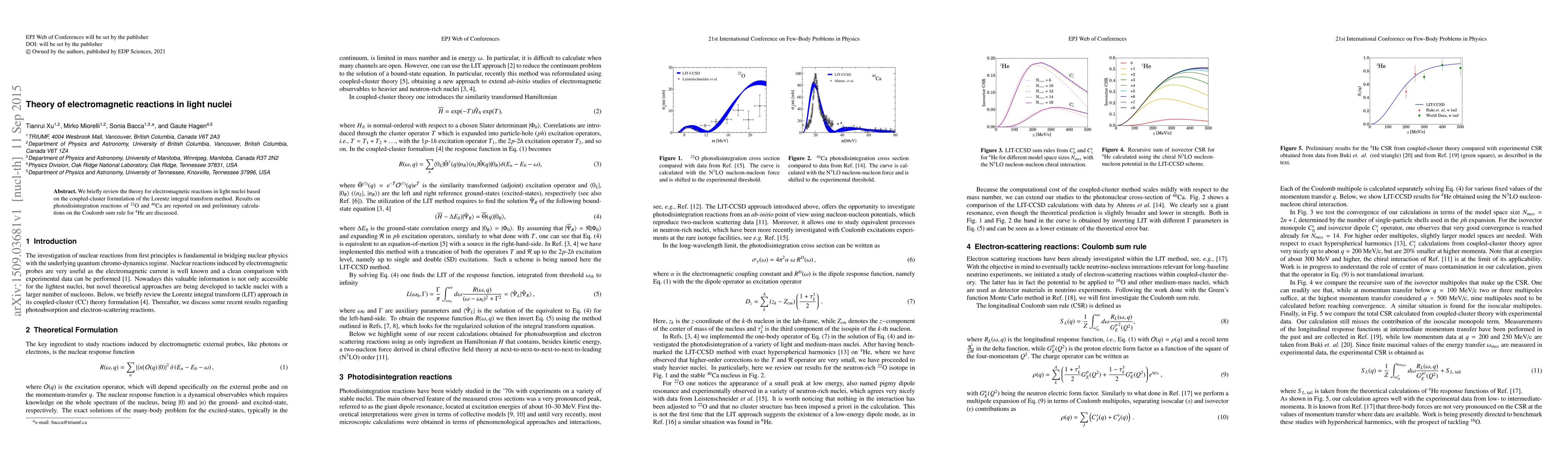 We briefly review the theory for electromagnetic reactions in light nuclei based on the coupled-cluster formulation of the Lorentz integral transform method. Results on photodisintegration reactions of 22O and 40Ca are reported on and preliminary calculations on the Coulomb sum rule for 4He are discussed.