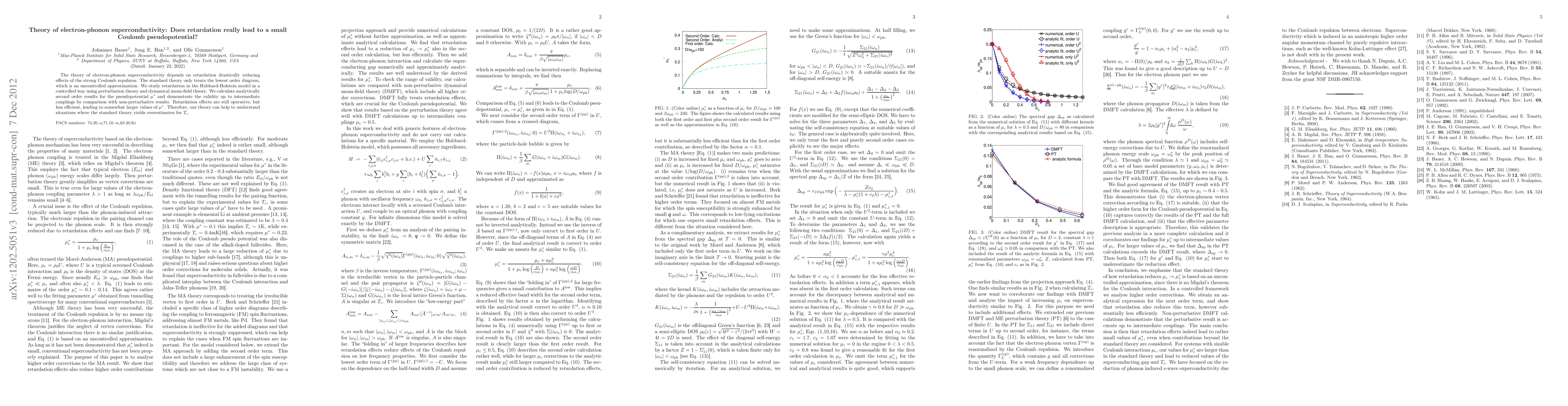 The theory of electron-phonon superconductivity depends on retardation drastically reducing effects of the strong Coulomb repulsion. The standard theory only treats the lowest order diagram, which is an uncontrolled approximation. We study retardation in the Hubbard-Holstein model in a controlled way using perturbation theory and dynamical mean-field theory. We calculate analytically second order results for the pseudopotential $\mu^*$ and demonstrate the validity up to intermediate couplings by comparison with non-perturbative results. Retardation effects are still operative, but less efficient, leading to somewhat larger values of $\mu^*$. Therefore, our theory can help to understand situations where the standard theory yields overestimates for $T_c$.
