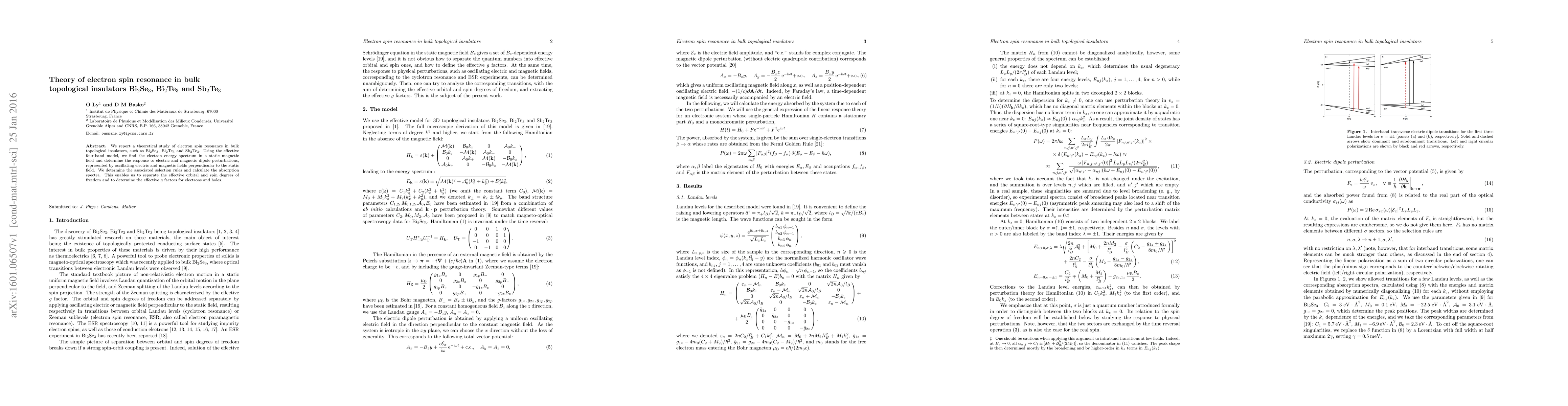 This paper theoretically investigates electron spin resonance in bulk topological insulators Bi2Se3, Bi2Te3, and Sb2Te3, using an effective four-band model to analyze the electron energy spectrum and absorption spectra under electric and magnetic dipole perturbations. The study determines the effective g-factors and selection rules for these materials.