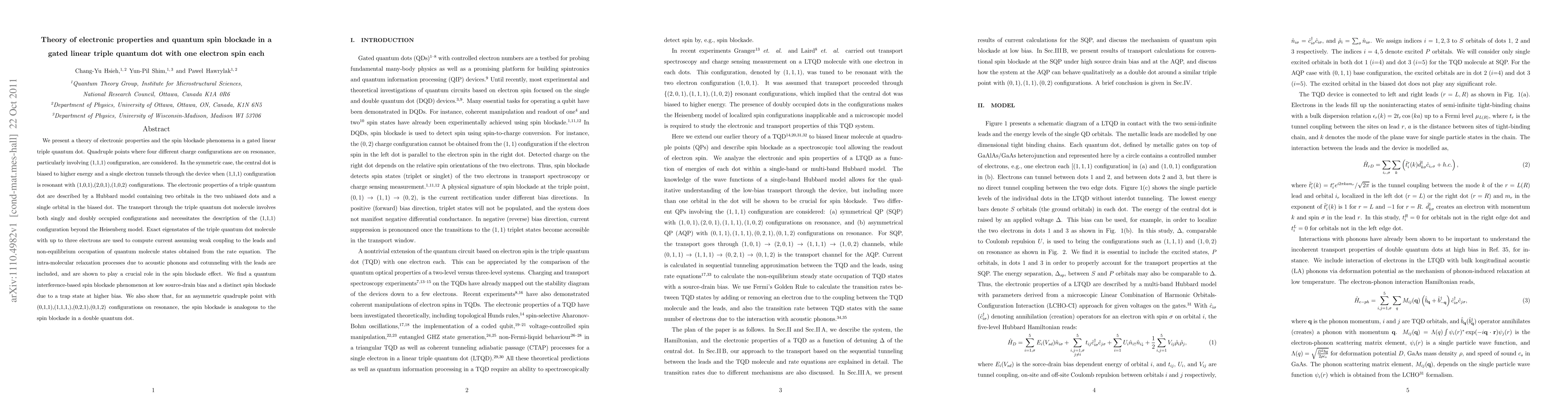 We present a theory of electronic properties and the spin blockade phenomena in a gated linear triple quantum dot. Quadruple points where four different charge configurations are on resonance, particularly involving (1,1,1) configuration, are considered. In the symmetric case, the central dot is biased to higher energy and a single electron tunnels through the device when (1,1,1) configuration is resonant with (1,0,1),(2,0,1),(1,0,2) configurations. The electronic properties of a triple quantum dot are described by a Hubbard model containing two orbitals in the two unbiased dots and a single orbital in the biased dot. The transport through the triple quantum dot molecule involves both singly and doubly occupied configurations and necessitates the description of the (1,1,1) configuration beyond the Heisenberg model. Exact eigenstates of the triple quantum dot molecule with up to three electrons are used to compute current assuming weak coupling to the leads and non-equilibrium occupation of quantum molecule states obtained from the rate equation. The intra-molecular relaxation processes due to acoustic phonons and cotunneling with the leads are included, and are shown to play a crucial role in the spin blockade effect. We find a quantum interference-based spin blockade phenomenon at low source-drain bias and a distinct spin blockade due to a trap state at higher bias. We also show that, for an asymmetric quadruple point with (0,1,1),(1,1,1,),(0,2,1),(0,1,2) configurations on resonance, the spin blockade is analogous to the spin blockade in a double quantum dot.