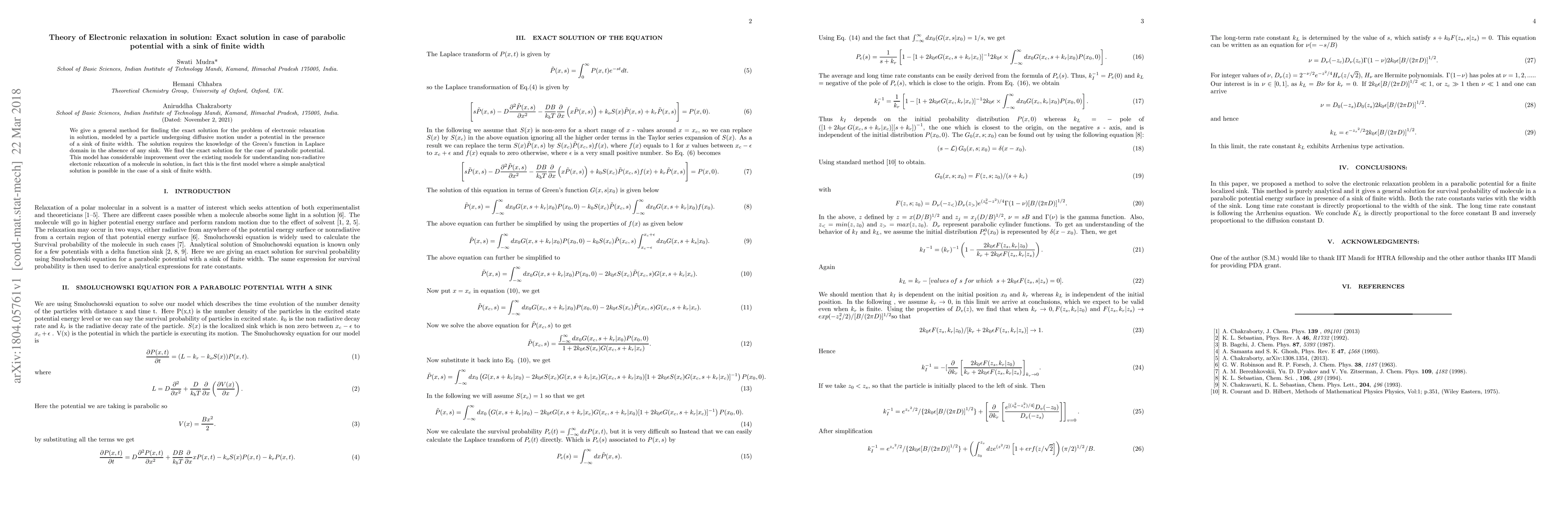 This paper presents a novel method for obtaining the exact solution of electronic relaxation in solution under a parabolic potential with a sink of finite width, utilizing the Green's function in the Laplace domain. This analytical solution significantly improves existing models for understanding non-radiative electronic relaxation in molecular systems.