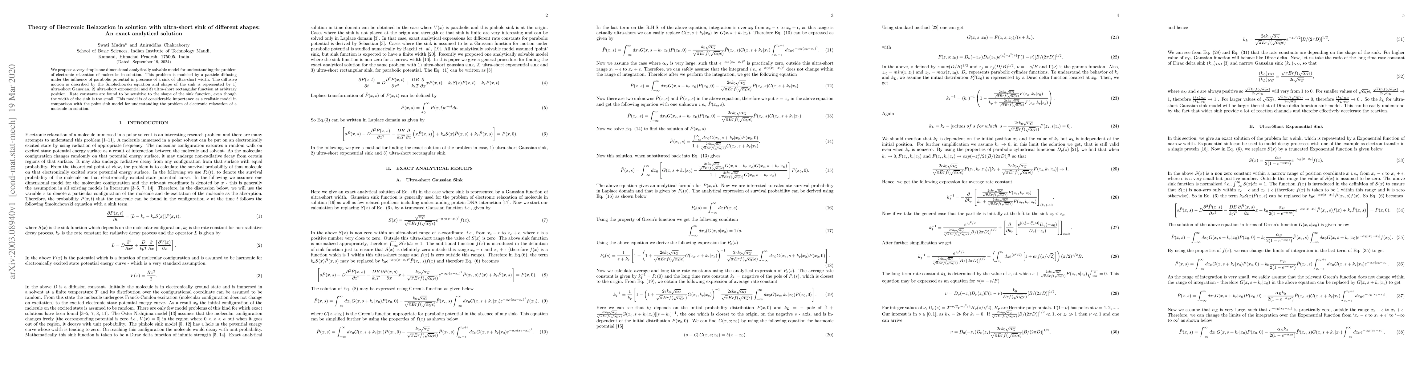 This paper proposes a one-dimensional analytical model for electronic relaxation in solution, considering different ultra-short sink shapes (Gaussian, exponential, and rectangular) to describe the diffusive motion of particles under a parabolic potential. The study finds that rate constants are significantly affected by the sink shape, highlighting the importance of the model over the traditional point sink model.