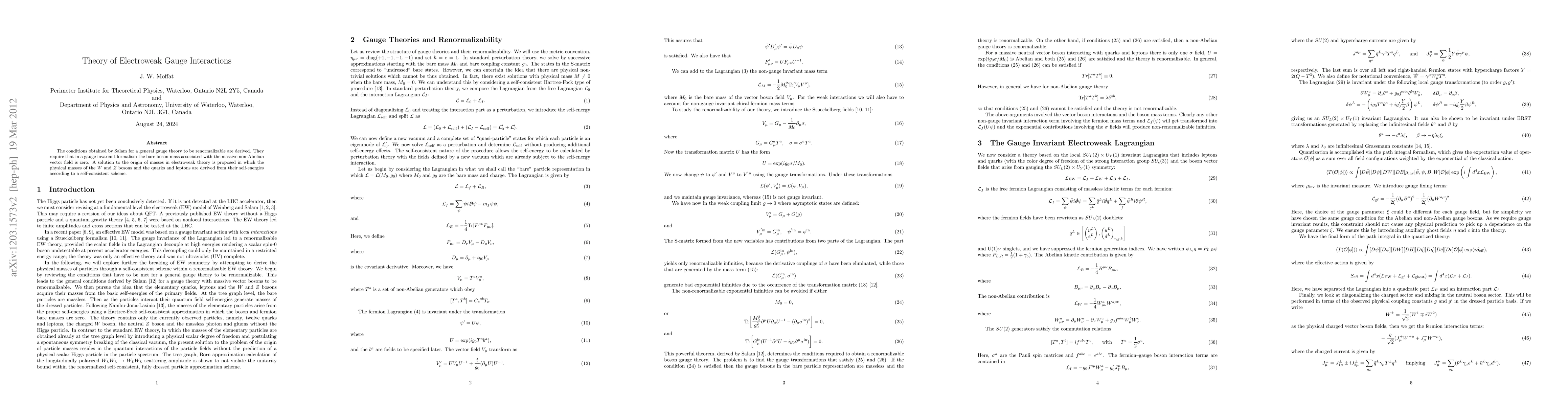 Researchers derive conditions for a gauge theory to be renormalizable, proposing a solution for electroweak theory where boson masses are derived from self-energies in a self-consistent scheme.