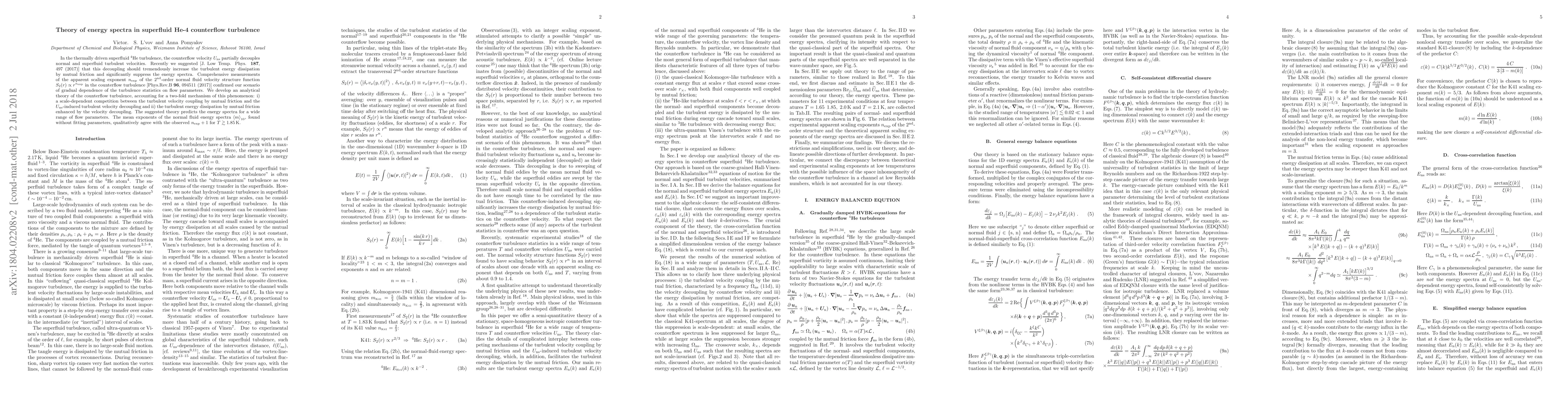 In the thermally driven superfluid He-4 turbulence, the counterflow velocity $U_{\rm ns}$ partially decouples the normal and superfluid turbulent velocities. Recently we suggested [J. Low Temp. Phys. 187, 497 (2017)] that this decoupling should tremendously increase the turbulent energy dissipation by mutual friction and significantly suppress the energy spectra. Comprehensive measurements of the apparent scaling exponent nexp of the 2nd-order normal fluid velocity structure function $S_2(r)\propto r^{n_{\rm exp}}$ in the counterflow turbulence [Phys.Rev.B 96, 094511 (2017)] confirmed our scenario of gradual dependence of the turbulence statistics on the flow parameters. We develop an analytical theory of the counterflow turbulence, accounting for a twofold mechanism of this phenomenon: i) a scale-dependent competition between the turbulent velocity coupling by the mutual friction and the $U_{\rm ns}$-induced turbulent velocity decoupling and ii) the turbulent energy dissipation by the mutual friction enhanced by the velocity decoupling. The suggested theory predicts the energy spectra for a wide range of flow parameters. The mean exponents of the normal fluid energy spectra $\langle m_n\rangle_{10}$, found without fitting parameters, qualitatively agree with the observed $n_{\rm exp} + 1$ for $T\gtrsim 1.85$K