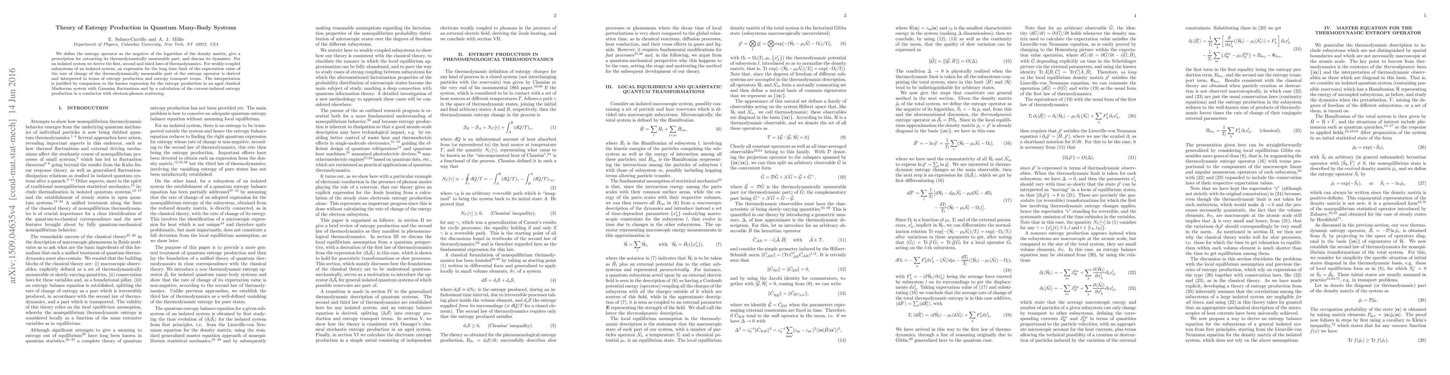 We define the entropy operator as the negative of the logarithm of the density matrix, give a prescription for extracting its thermodynamically measurable part, and discuss its dynamics. For an isolated system we derive the first, second and third laws of thermodynamics. For weakly-coupled subsystems of an isolated system, an expression for the long time limit of the expectation value of the rate of change of the thermodynamically measurable part of the entropy operator is derived and interpreted in terms of entropy production and entropy transport terms. The interpretation is justified by comparison to the known expression for the entropy production in an aged classical Markovian system with Gaussian fluctuations and by a calculation of the current-induced entropy production in a conductor with electron-phonon scattering.