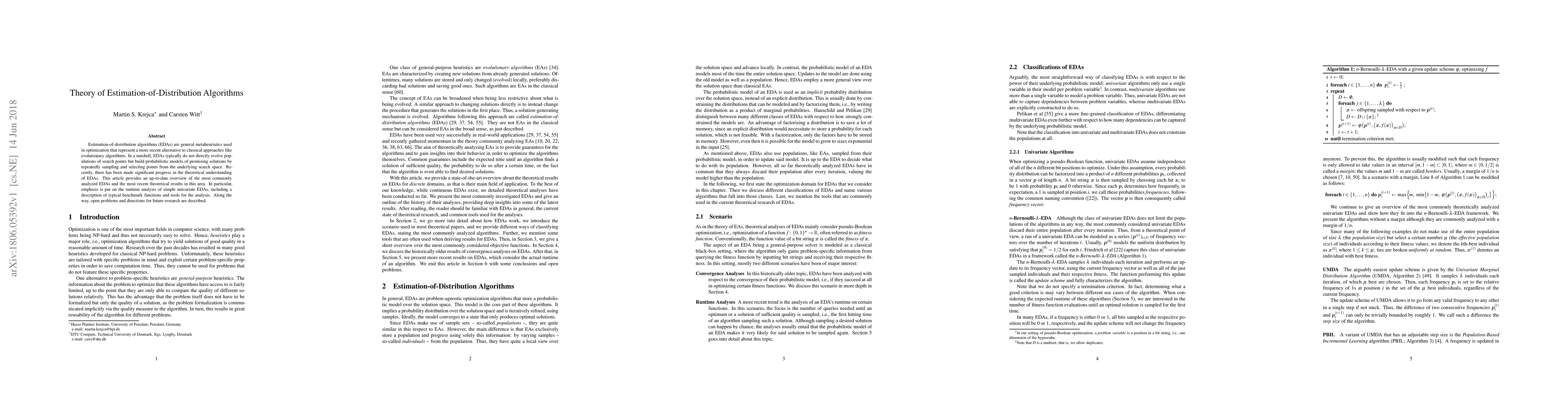 Estimation-of-distribution algorithms (EDAs) are general metaheuristics used in optimization that represent a more recent alternative to classical approaches like evolutionary algorithms. In a nutshell, EDAs typically do not directly evolve populations of search points but build probabilistic models of promising solutions by repeatedly sampling and selecting points from the underlying search space. Recently, there has been made significant progress in the theoretical understanding of EDAs. This article provides an up-to-date overview of the most commonly analyzed EDAs and the most recent theoretical results in this area. In particular, emphasis is put on the runtime analysis of simple univariate EDAs, including a description of typical benchmark functions and tools for the analysis. Along the way, open problems and directions for future research are described.