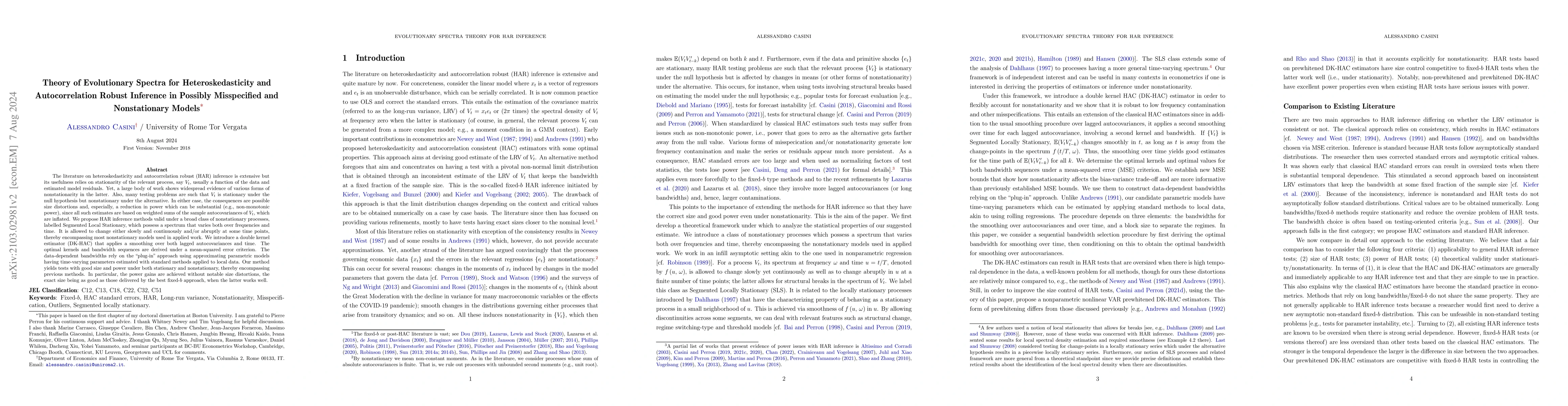We develop a theory of evolutionary spectra for heteroskedasticity and autocorrelation robust (HAR) inference when the data may not satisfy second-order stationarity. Nonstationarity is a common feature of economic time series which may arise either from parameter variation or model misspecification. In such a context, the theories that support HAR inference are either not applicable or do not provide accurate approximations. HAR tests standardized by existing long-run variance estimators then may display size distortions and little or no power. This issue can be more severe for methods that use long bandwidths (i.e., fixed-b HAR tests). We introduce a class of nonstationary processes that have a time-varying spectral representation which evolves continuously except at a finite number of time points. We present an extension of the classical heteroskedasticity and autocorrelation consistent (HAC) estimators that applies two smoothing procedures. One is over the lagged autocovariances, akin to classical HAC estimators, and the other is over time. The latter element is important to flexibly account for nonstationarity. We name them double kernel HAC (DK-HAC) estimators. We show the consistency of the estimators and obtain an optimal DK-HAC estimator under the mean squared error (MSE) criterion. Overall, HAR tests standardized by the proposed DK-HAC estimators are competitive with fixed-b HAR tests, when the latter work well, with regards to size control even when there is strong dependence. Notably, in those empirically relevant situations in which previous HAR tests are undersized and have little or no power, the DK-HAC estimator leads to tests that have good size and power.
