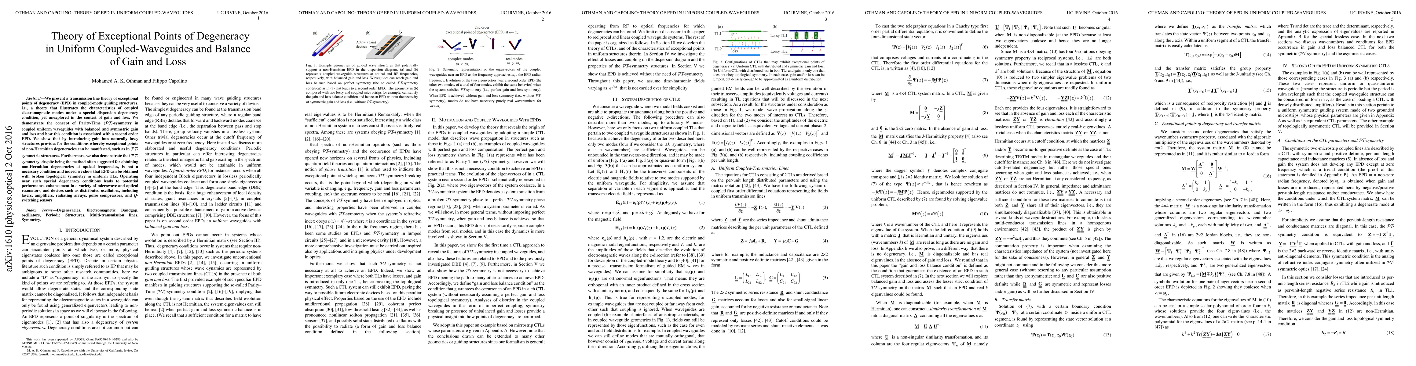 This paper develops a transmission line theory for exceptional points of degeneracy (EPD) in coupled-waveguide systems, showing that balanced gain and loss can create non-Hermitian degeneracies. It demonstrates that $\mathcal{PT}$-symmetry is not necessary for EPD, and suggests these conditions can enhance performance in various optical and microwave devices.