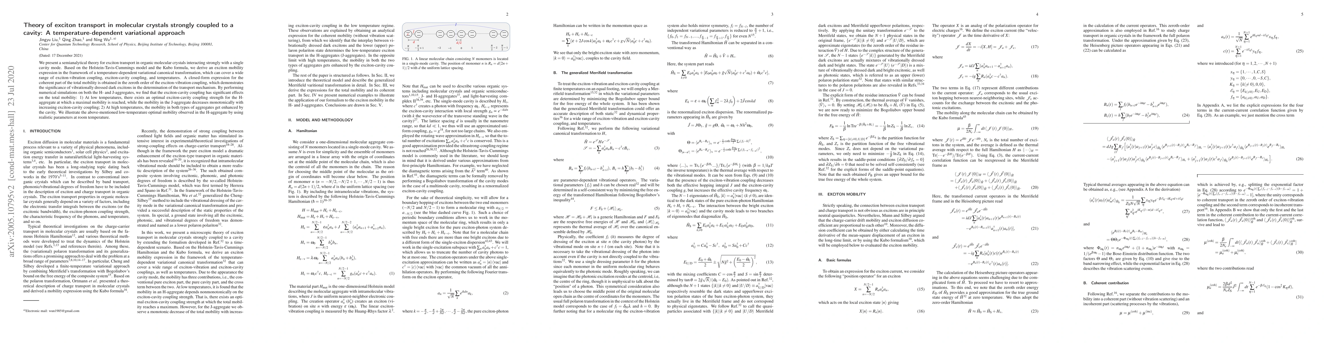 This paper develops a semianalytical theory for exciton transport in organic molecular crystals strongly coupled with a cavity, deriving an expression for exciton mobility based on the Holstein-Tavis-Cummings model and a temperature-dependent variational approach. The study reveals significant effects of exciton-cavity coupling on mobility, showing optimal mobility in H-aggregates at low temperatures and enhanced mobility in both H- and J-aggregates at high temperatures.
