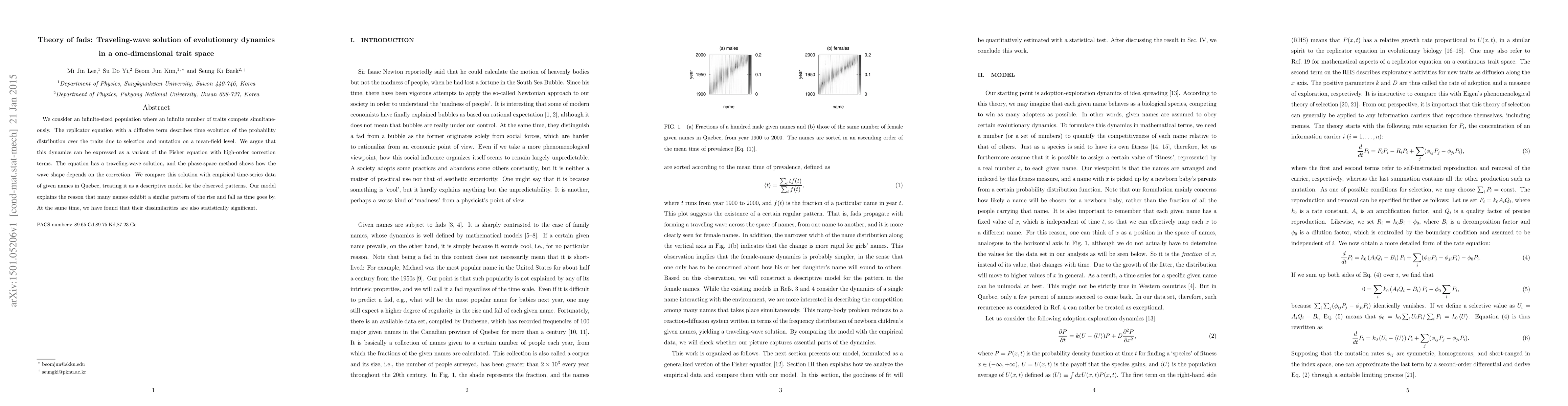 We consider an infinite-sized population where an infinite number of traits compete simultaneously. The replicator equation with a diffusive term describes time evolution of the probability distribution over the traits due to selection and mutation on a mean-field level. We argue that this dynamics can be expressed as a variant of the Fisher equation with high-order correction terms. The equation has a traveling-wave solution, and the phase-space method shows how the wave shape depends on the correction. We compare this solution with empirical time-series data of given names in Quebec, treating it as a descriptive model for the observed patterns. Our model explains the reason that many names exhibit a similar pattern of the rise and fall as time goes by. At the same time, we have found that their dissimilarities are also statistically significant.