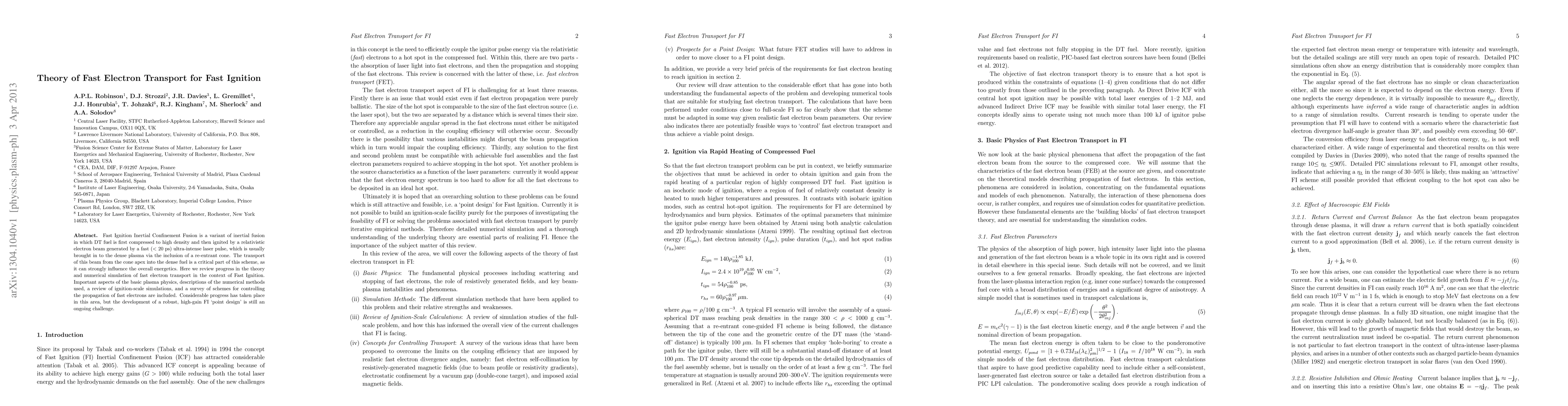 This paper reviews the theoretical and numerical advancements in understanding fast electron transport in Fast Ignition Inertial Confinement Fusion, focusing on the critical role of relativistic electron beams in igniting compressed DT fuel. Despite significant progress, developing a robust, high-gain ignition design remains an ongoing challenge.