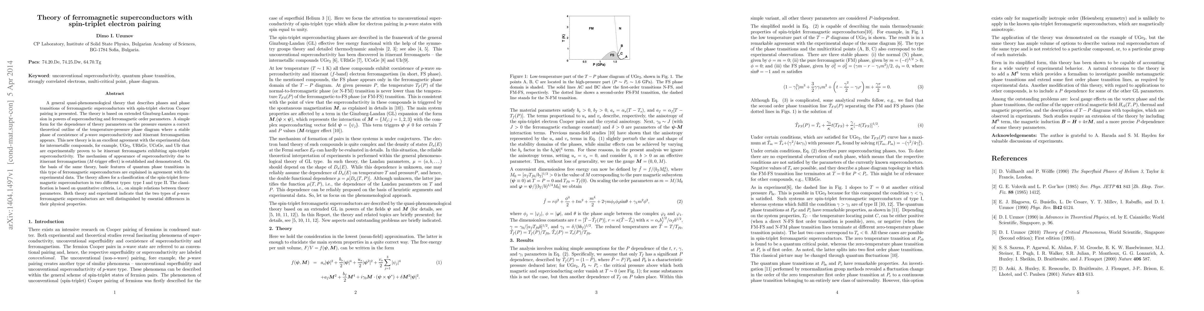 This research presents a quasi-phenomenological theory for ferromagnetic superconductors with spin-triplet pairing, based on an extended Ginzburg-Landau expansion. The theory accurately describes phase transitions and predicts stable coexistence of p-wave superconductivity and ferromagnetism, classifying these materials into two distinct types, I and II.